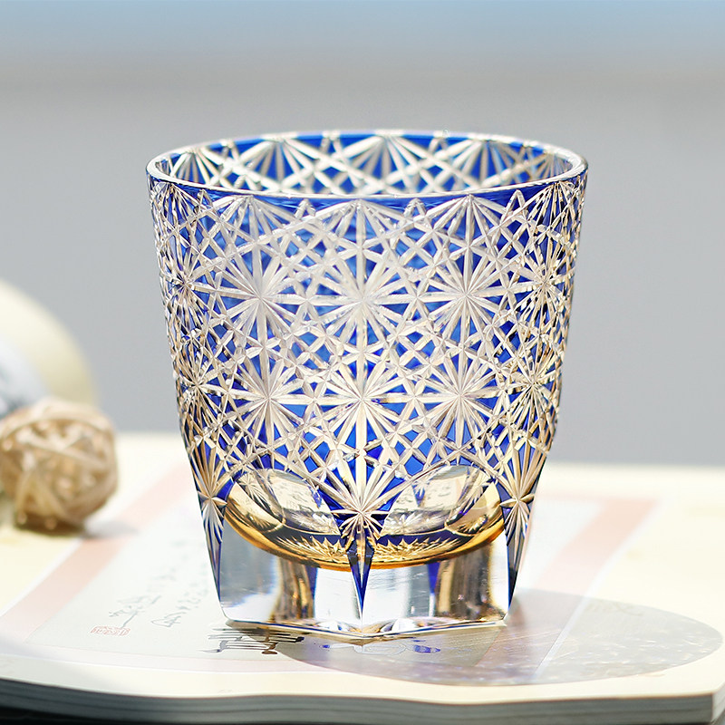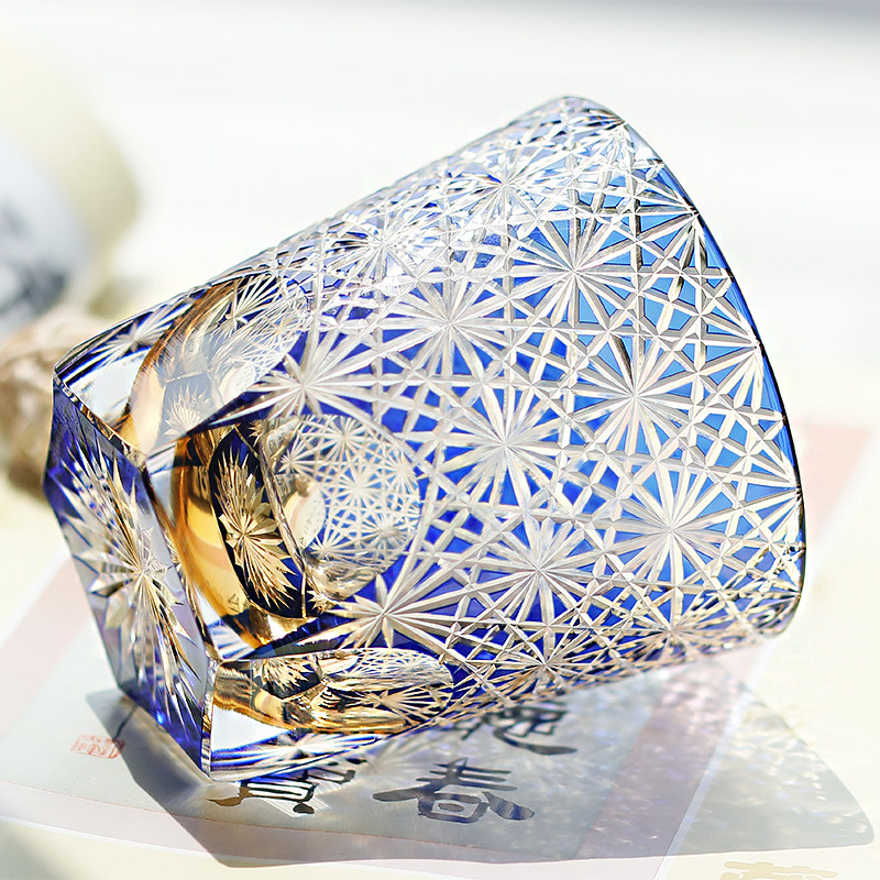 美浓烧日式江户切子蓝雏菊威士忌酒杯手工雕刻酒杯水晶玻璃洋酒杯