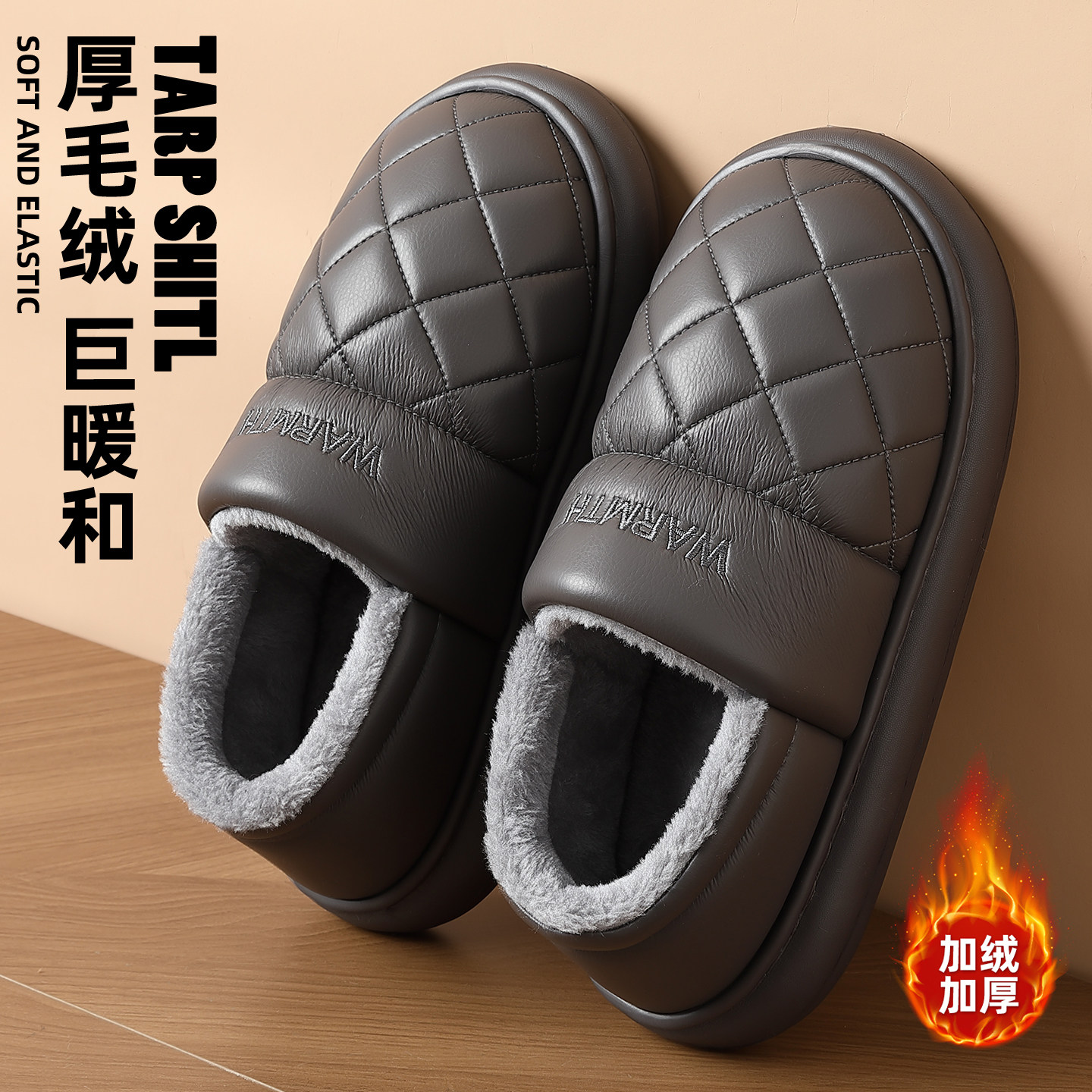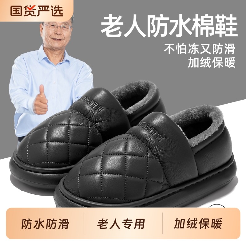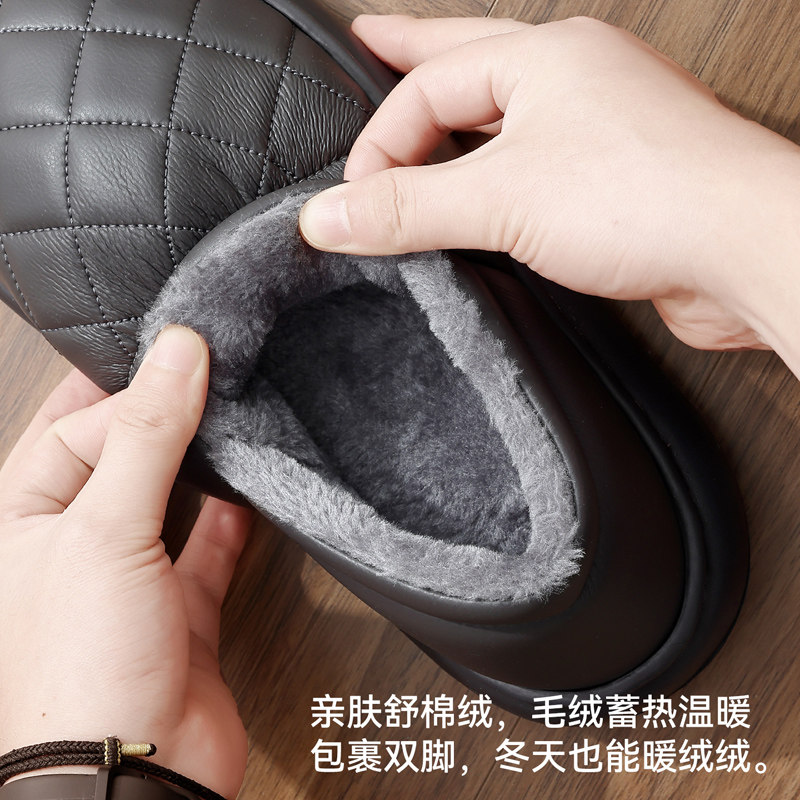 老人棉拖鞋女包跟冬季防水防滑厚底情侣加绒保暖带跟皮面男士棉鞋