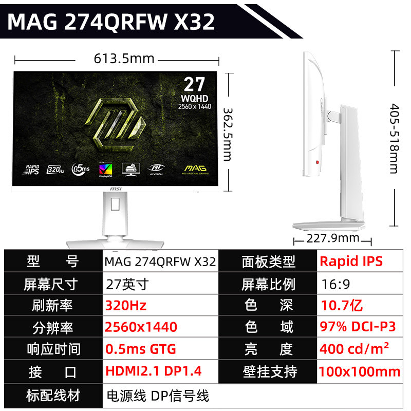 微星27英寸MAG 274QRFW X32 2K 320Hz液晶IPS电竞游戏显示器180Hz