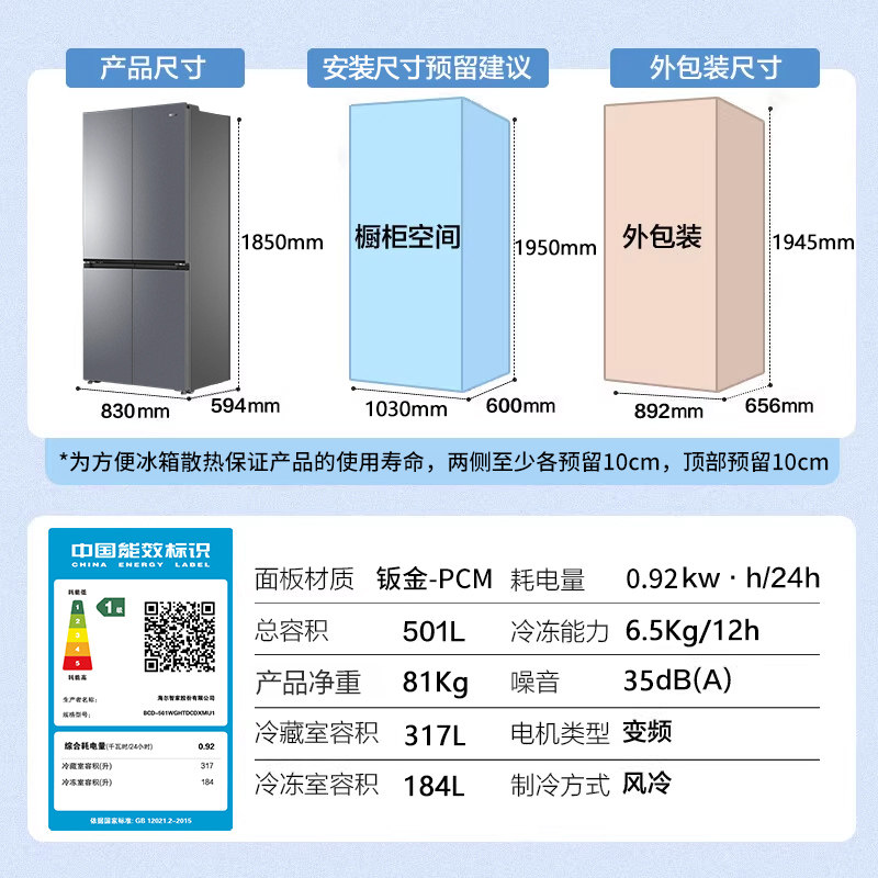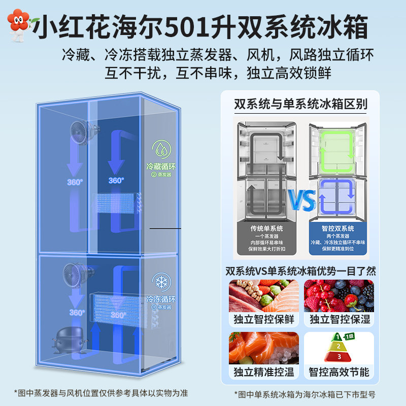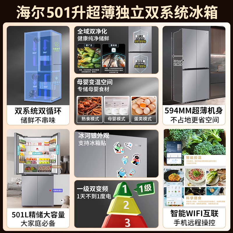 双系统】海尔无霜冰箱501L双开门超薄594mm可嵌入式家用一级能效