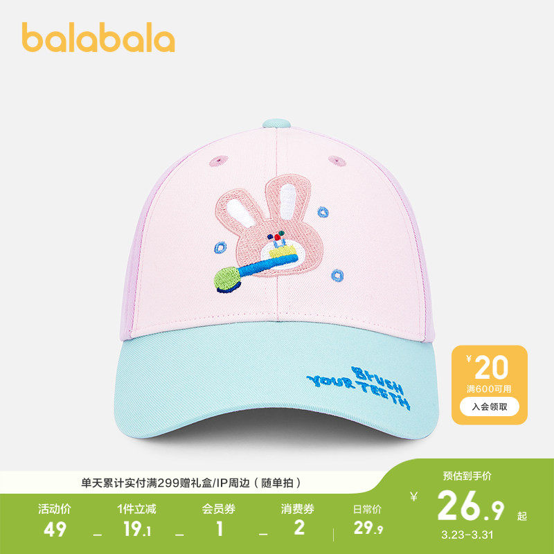 巴拉巴拉儿童帽子男女童棒球帽抗UV遮阳撞色卡通舒适遮阳防晒帽潮