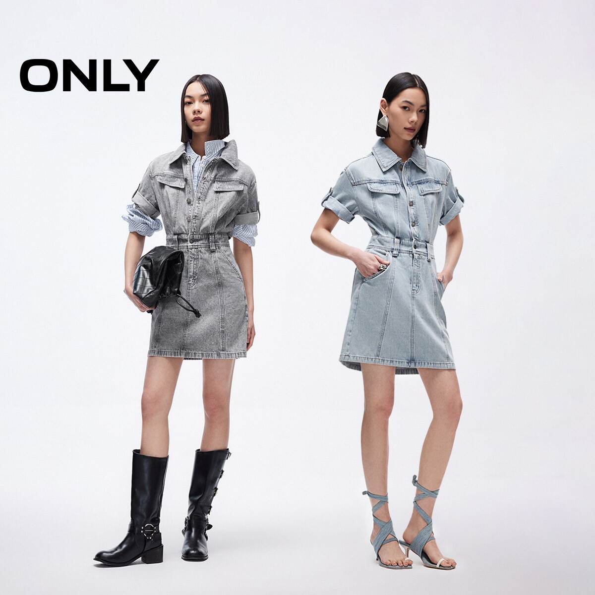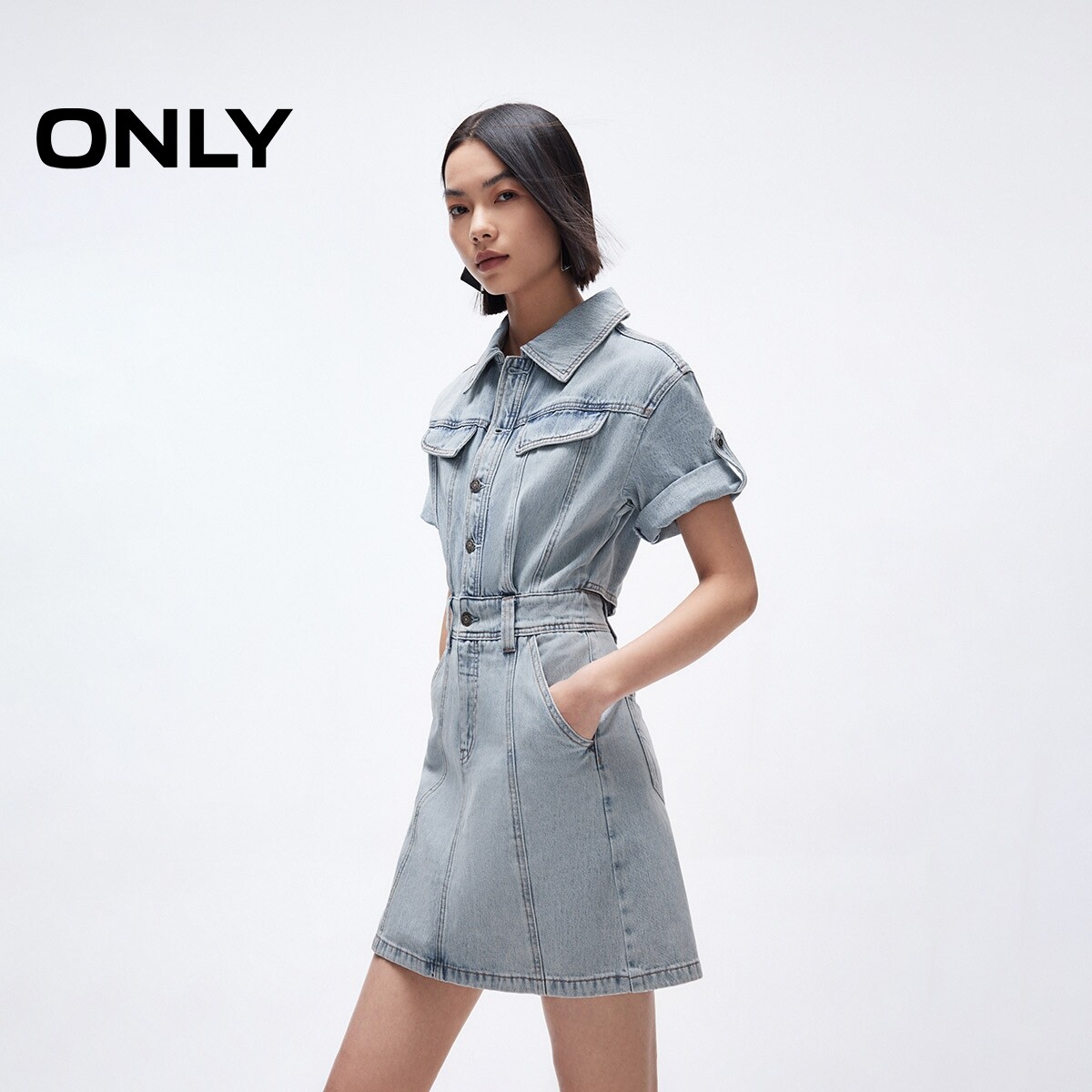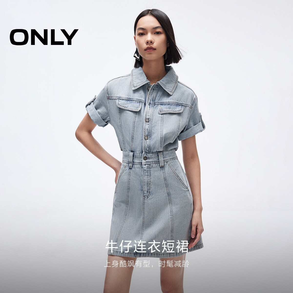 【ONLY奥莱】春季新款做旧性感露腰设计翻领短袖牛仔短裙连衣裙女