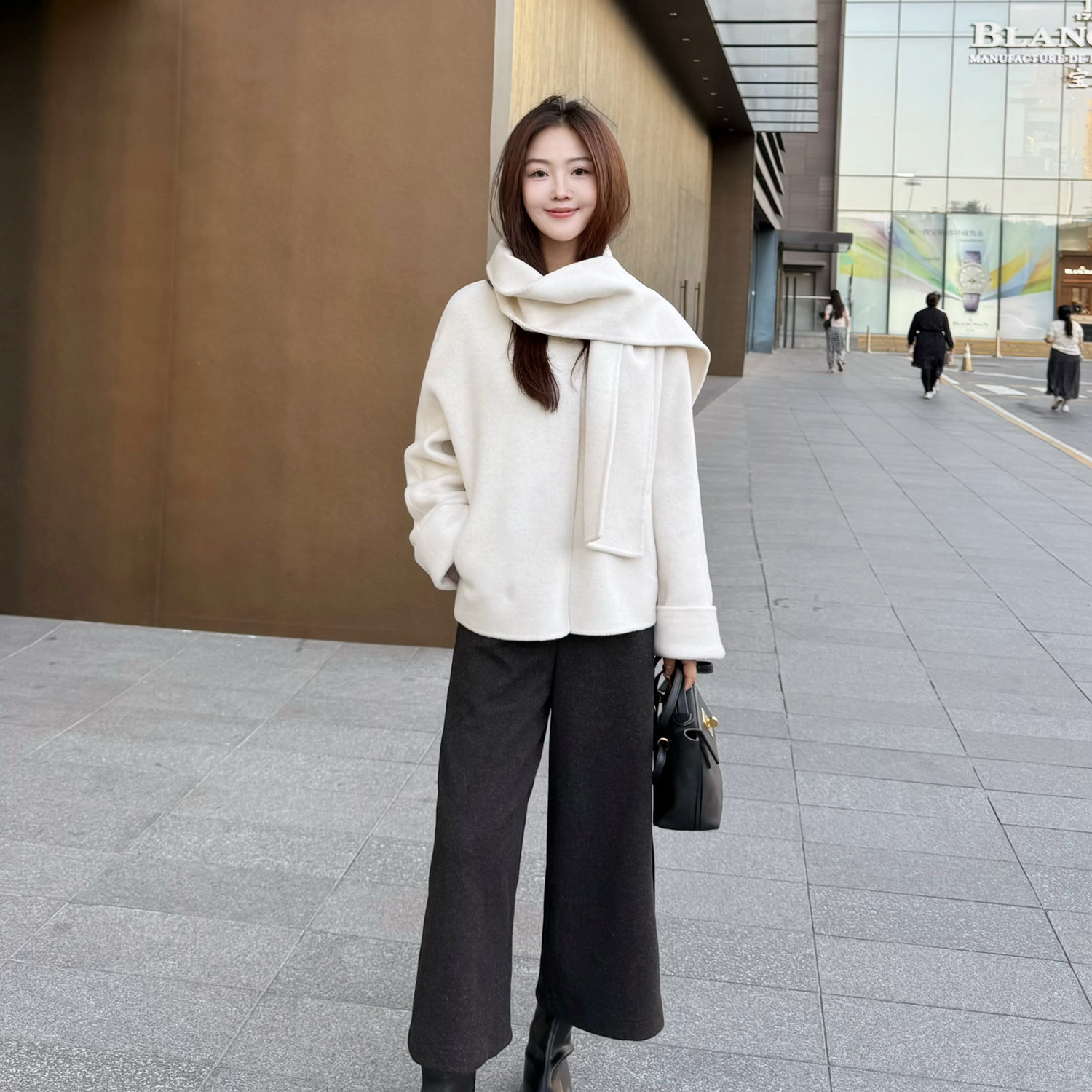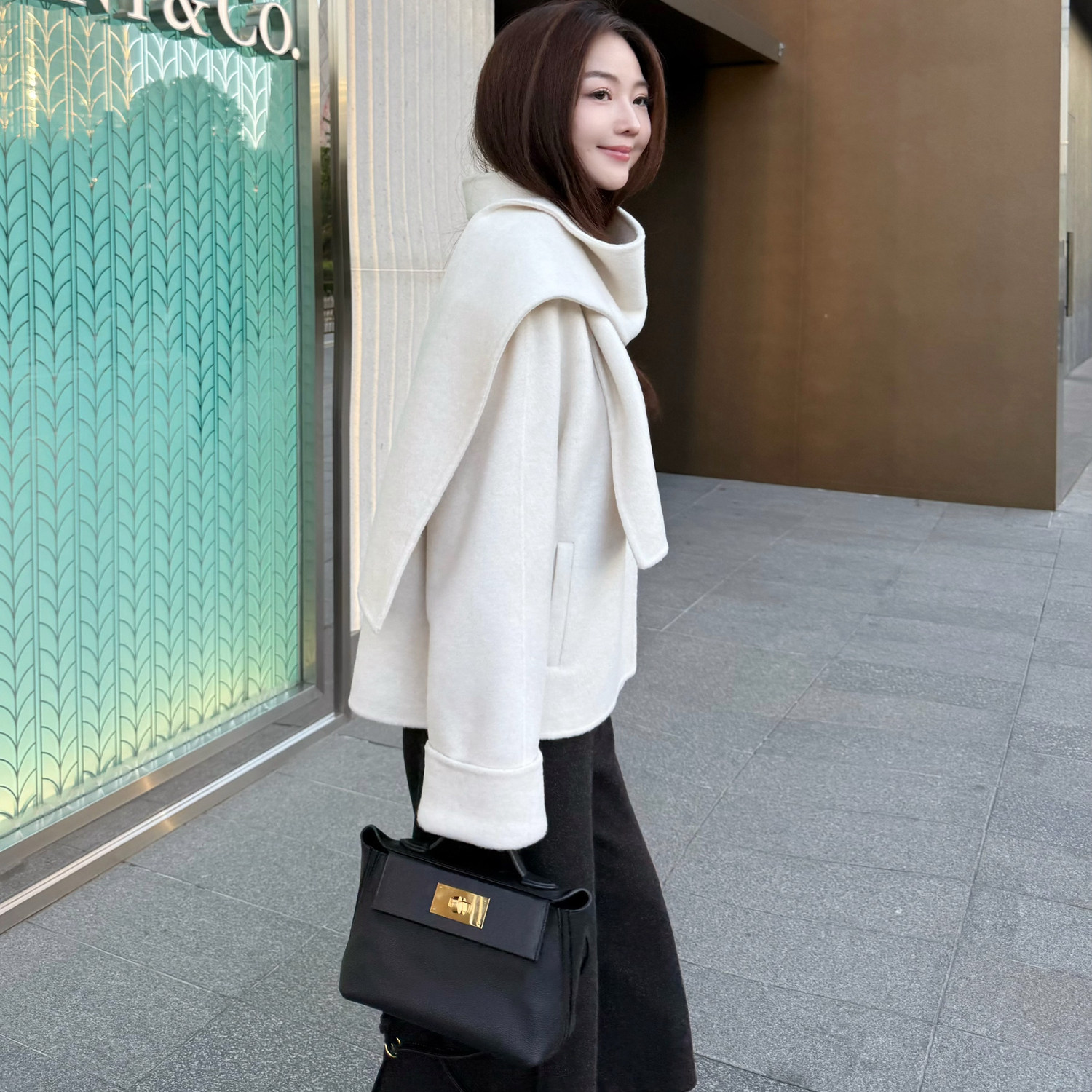 曹大曼 极简轻奢米白色围巾短款羊毛呢大衣外套山羊绒双面呢上衣