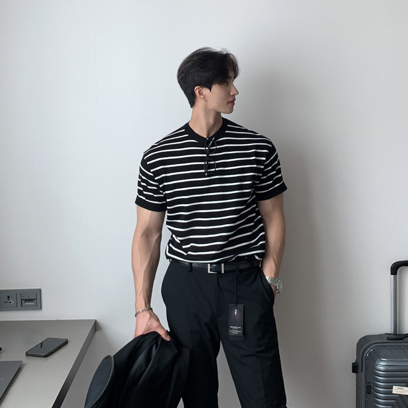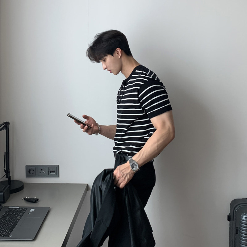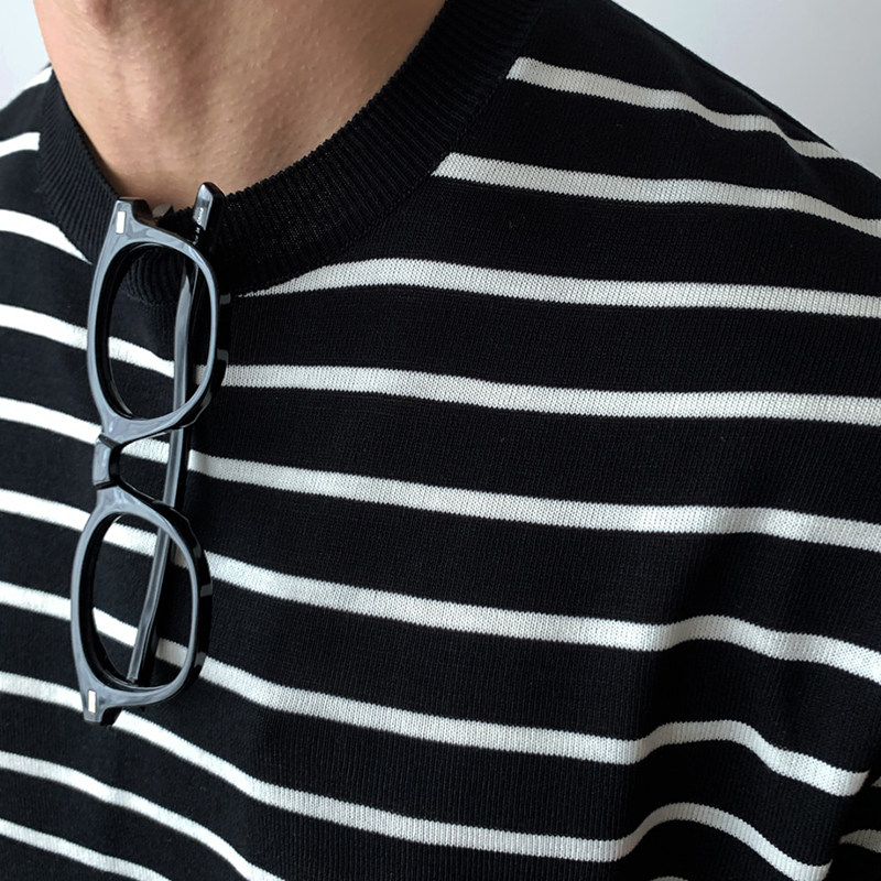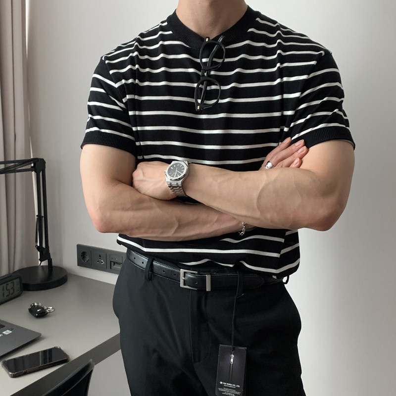 碧舍夏季新款男士黑白条纹上衣基础款体恤韩版宽松套头圆领短袖潮