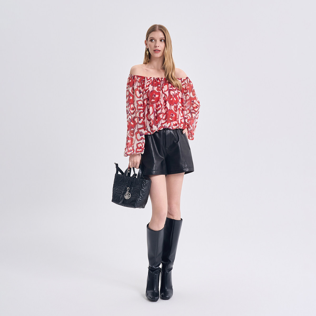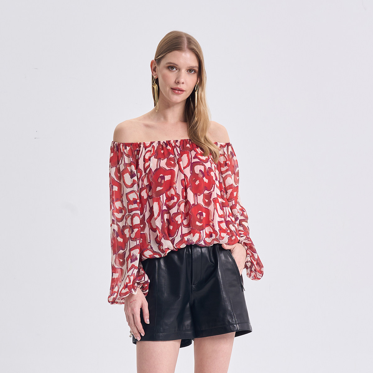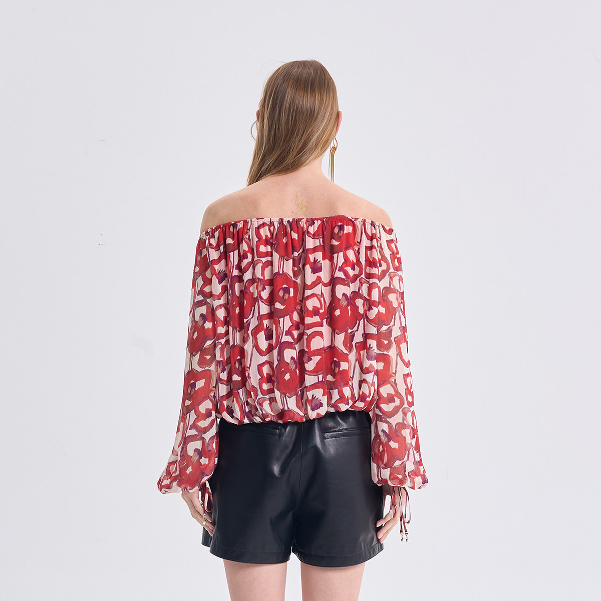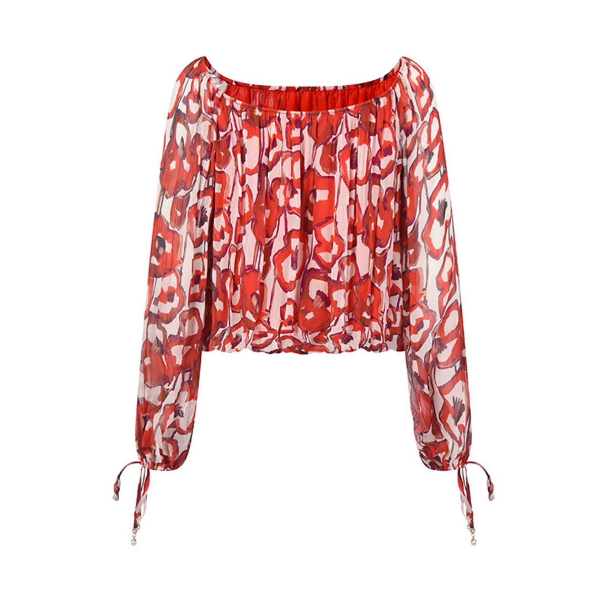 【虞美人系列】RARE威雅女装2026春夏新款红色纱纺长袖露肩上衣女