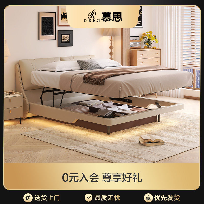现代简约家用1.5米1.8米主卧气压功能奶油风储物可定制高端真皮床