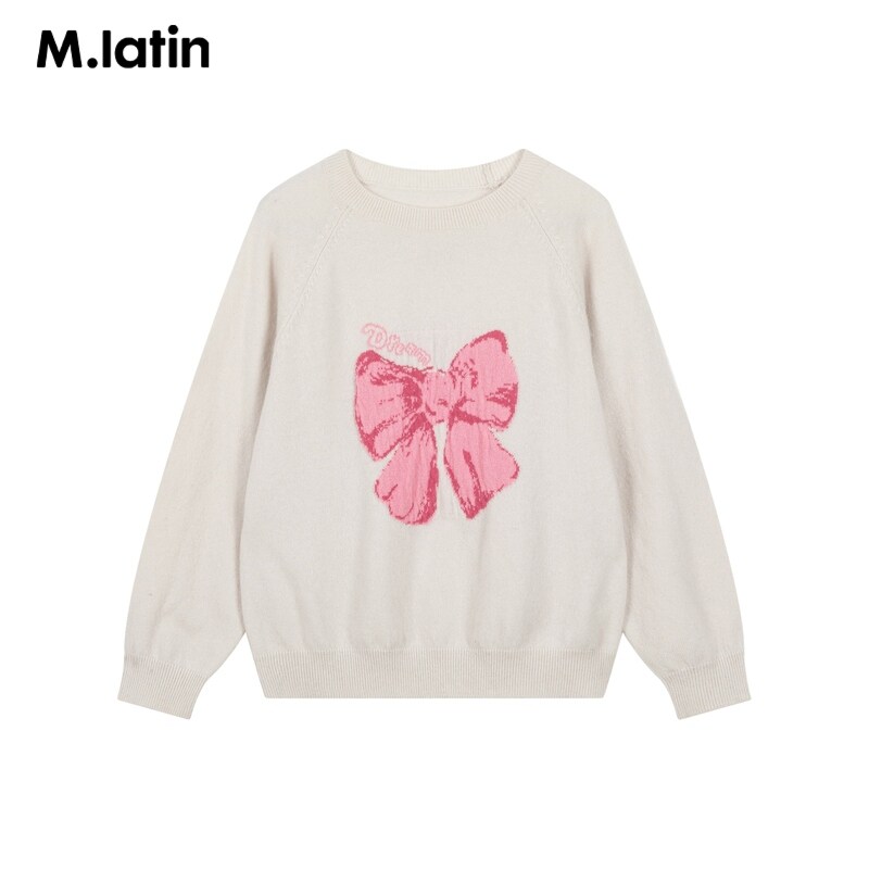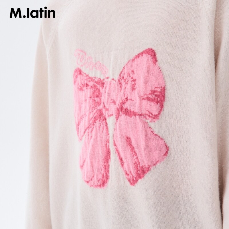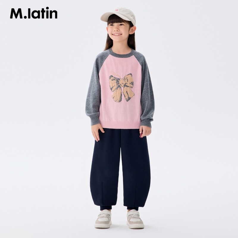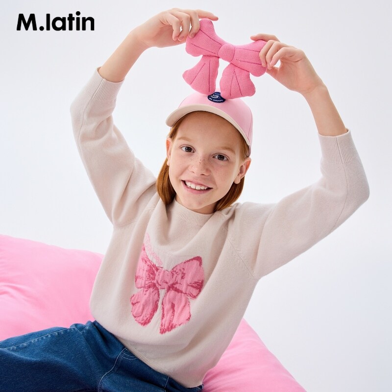 马拉丁童装儿童毛衣冬新款女童大童蝴蝶结提花撞色插肩袖羊绒衫