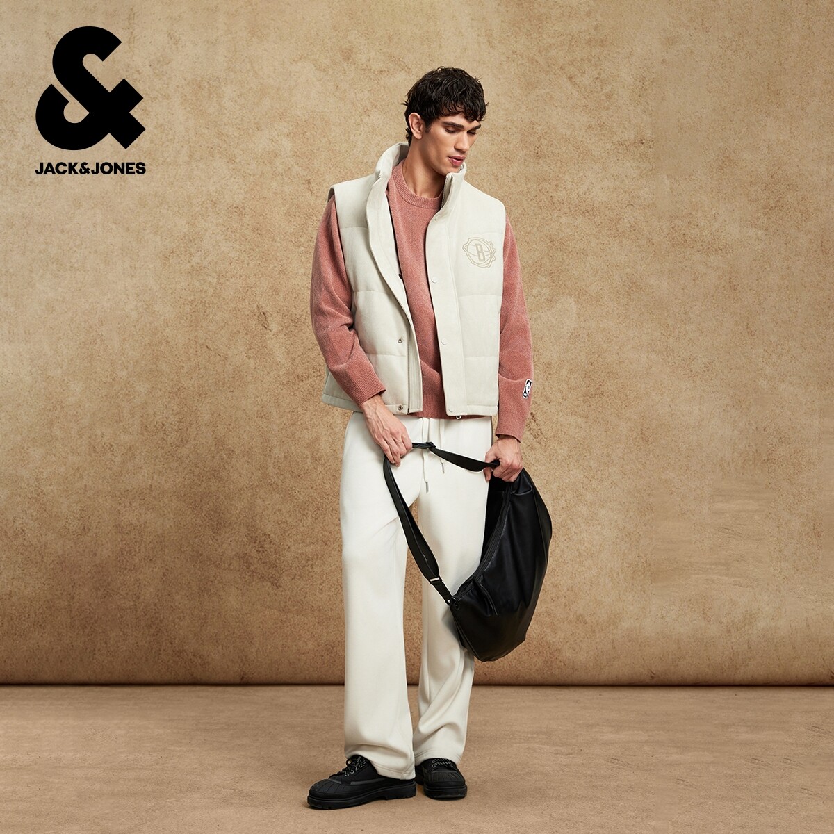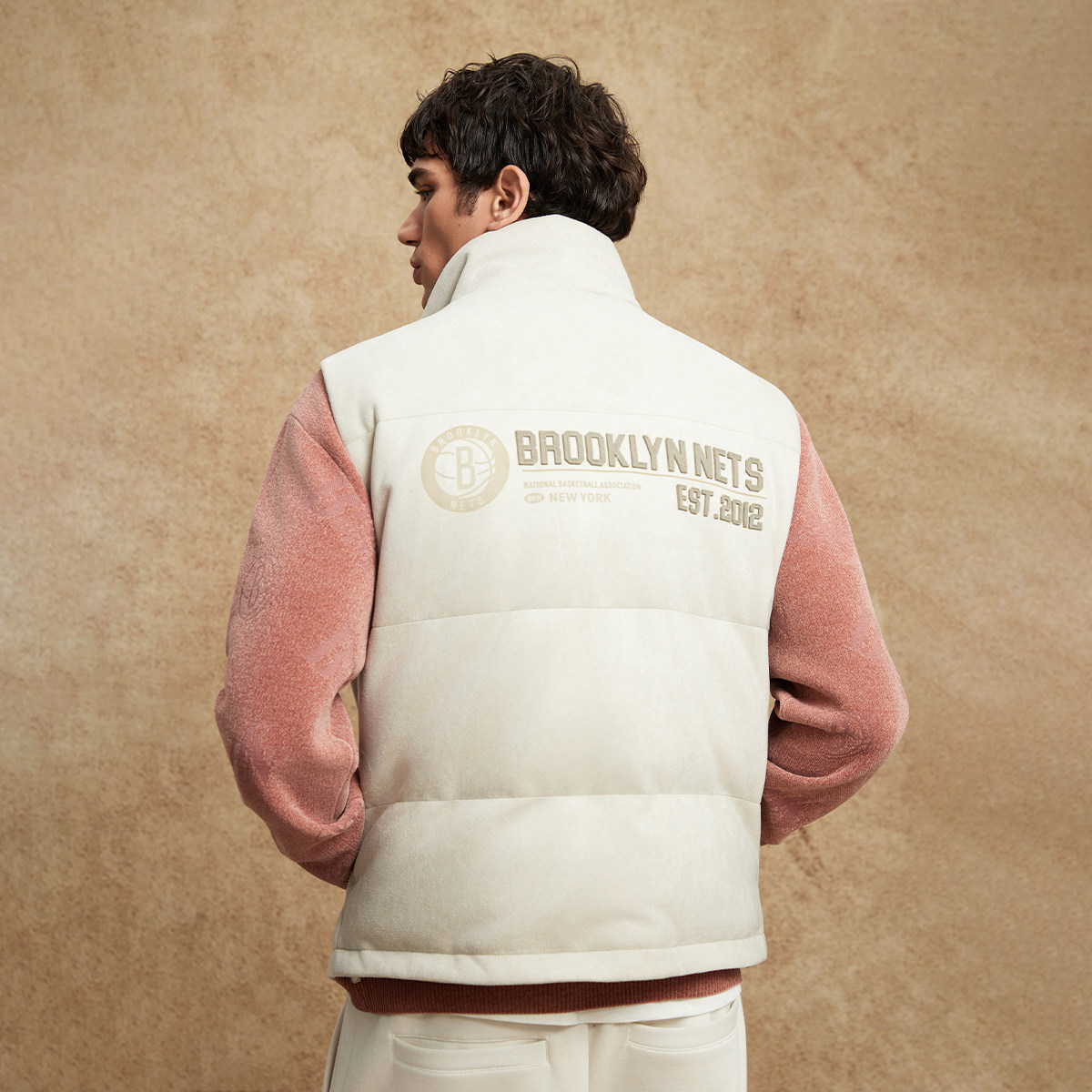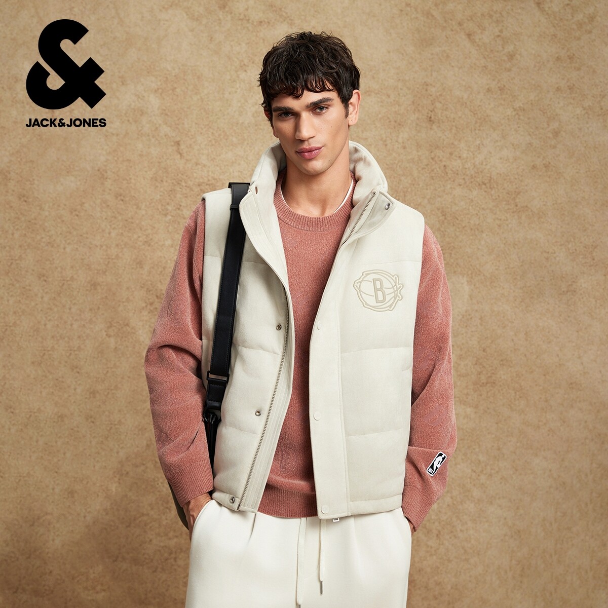 杰克琼斯NBA联名篮网队2025年新款男装冬季马甲印花立领羽绒上衣