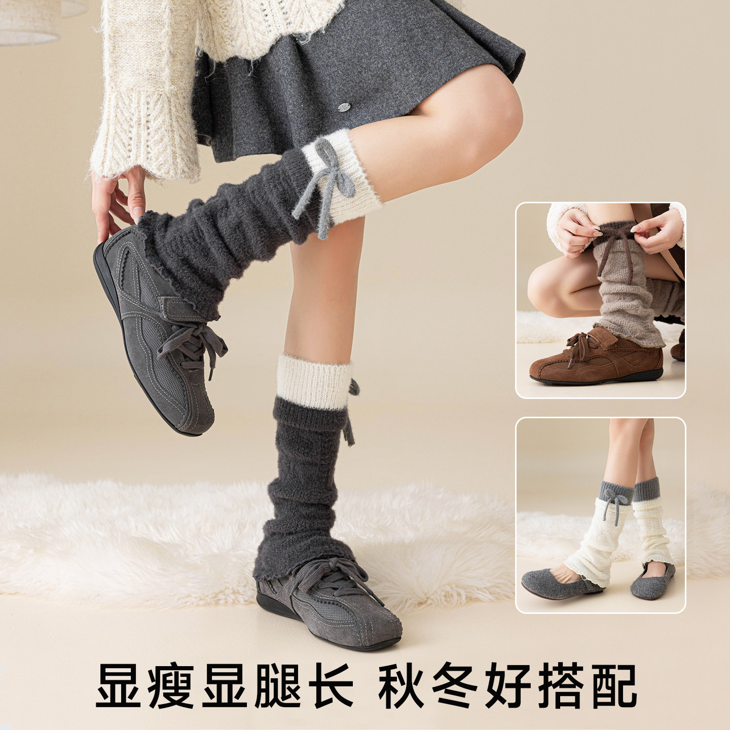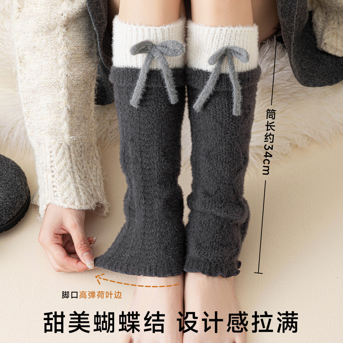 蝴蝶结堆堆袜套女秋冬加厚甜美拼接美拉德保暖小腿粗针中筒袜腿套