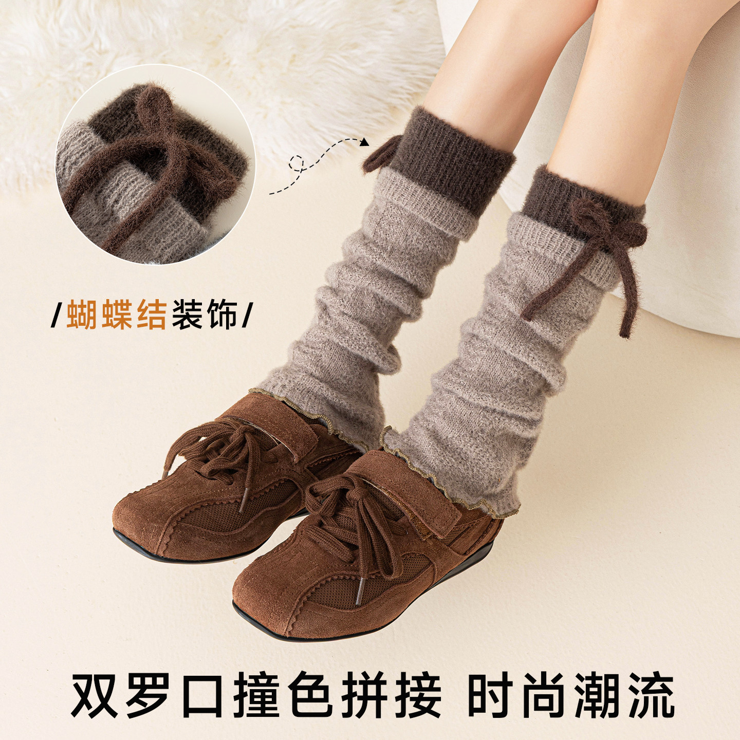 蝴蝶结双罗口拼色袜套 保暖亲肤