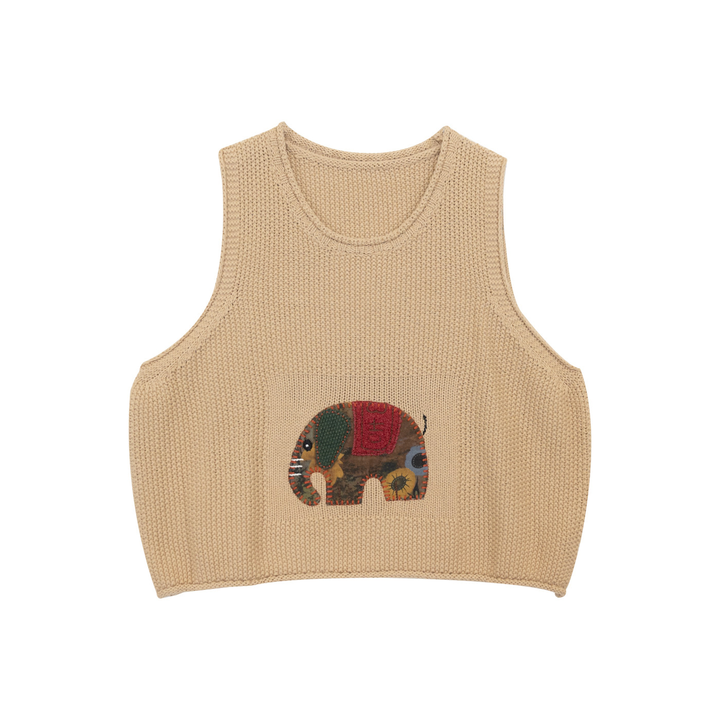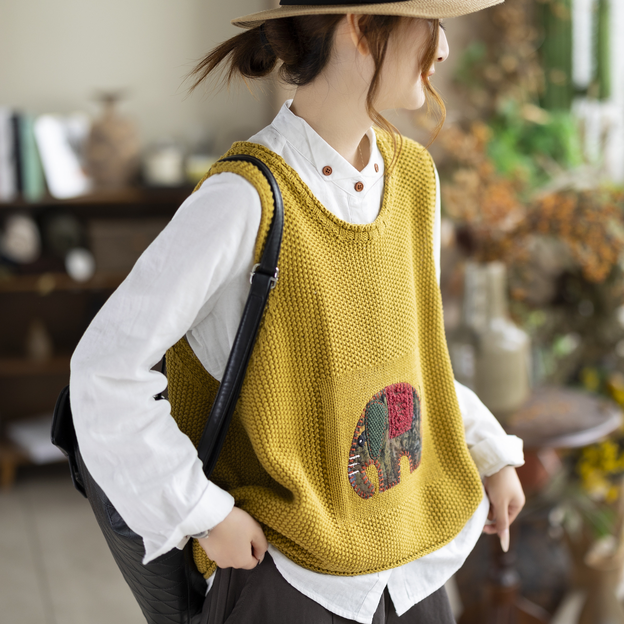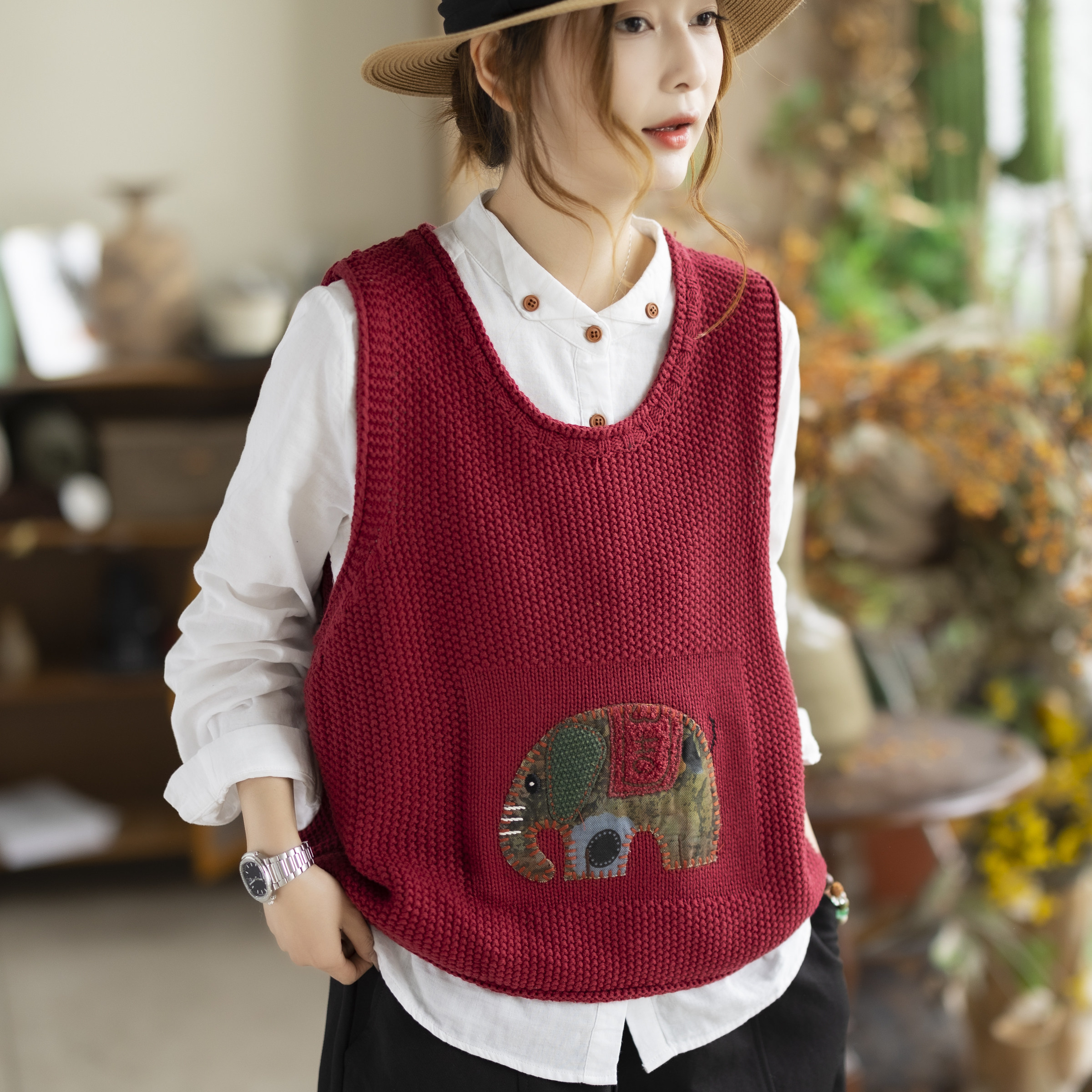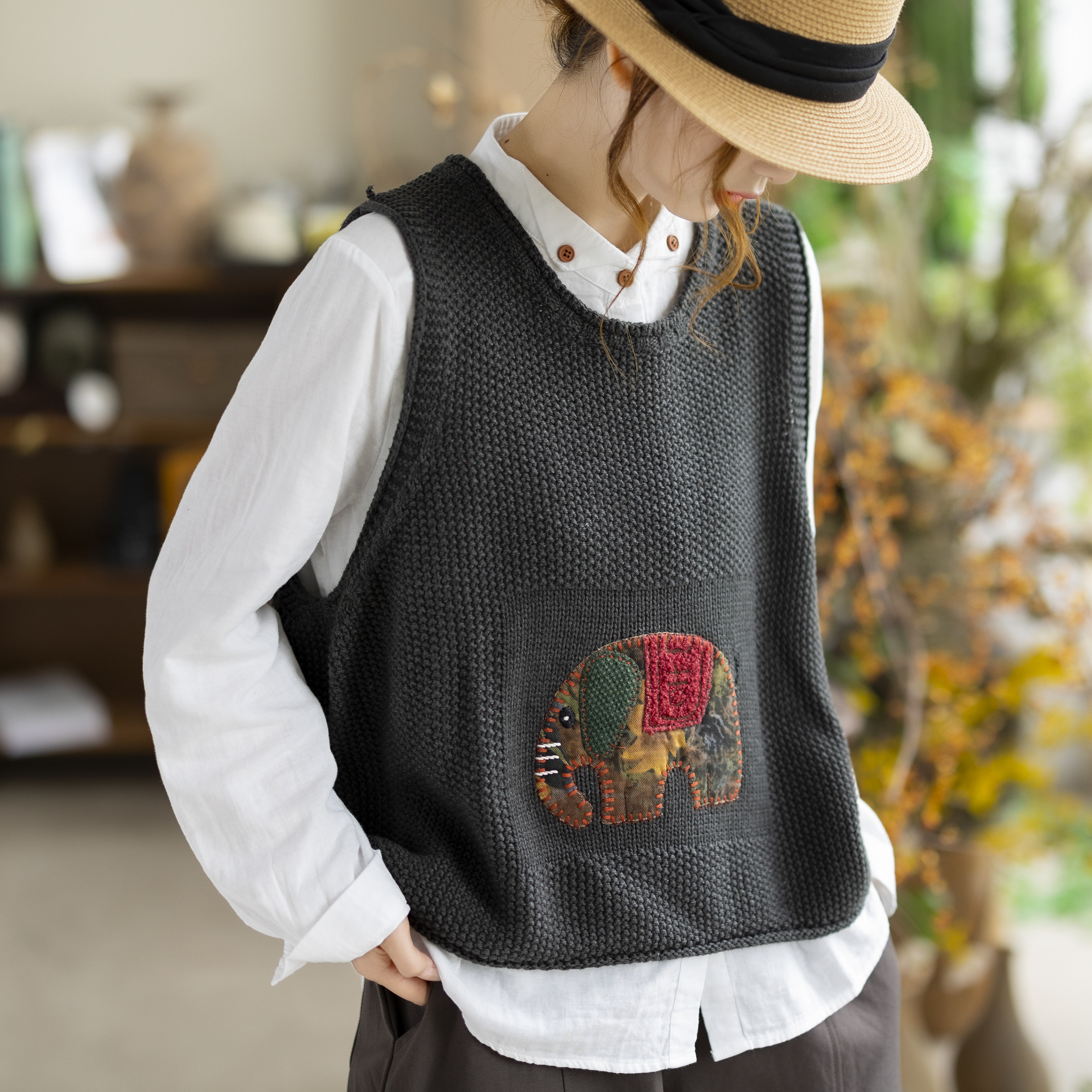 咖咪羽新款复古贴布学院风立体象图案针织马甲无袖背心休闲马夹