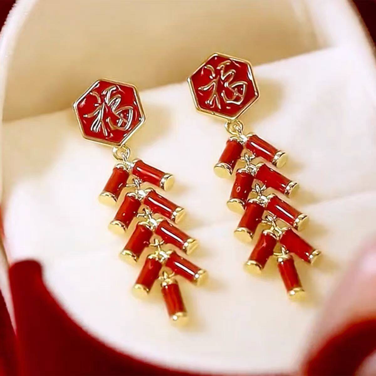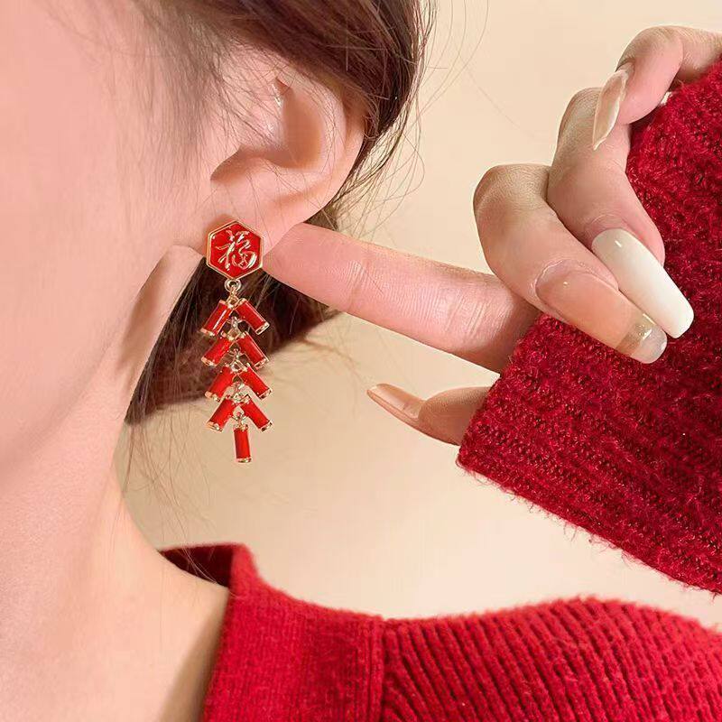 2026新年喜庆红色福字鞭炮耳坠长款中国风高级感耳饰女时尚民族风