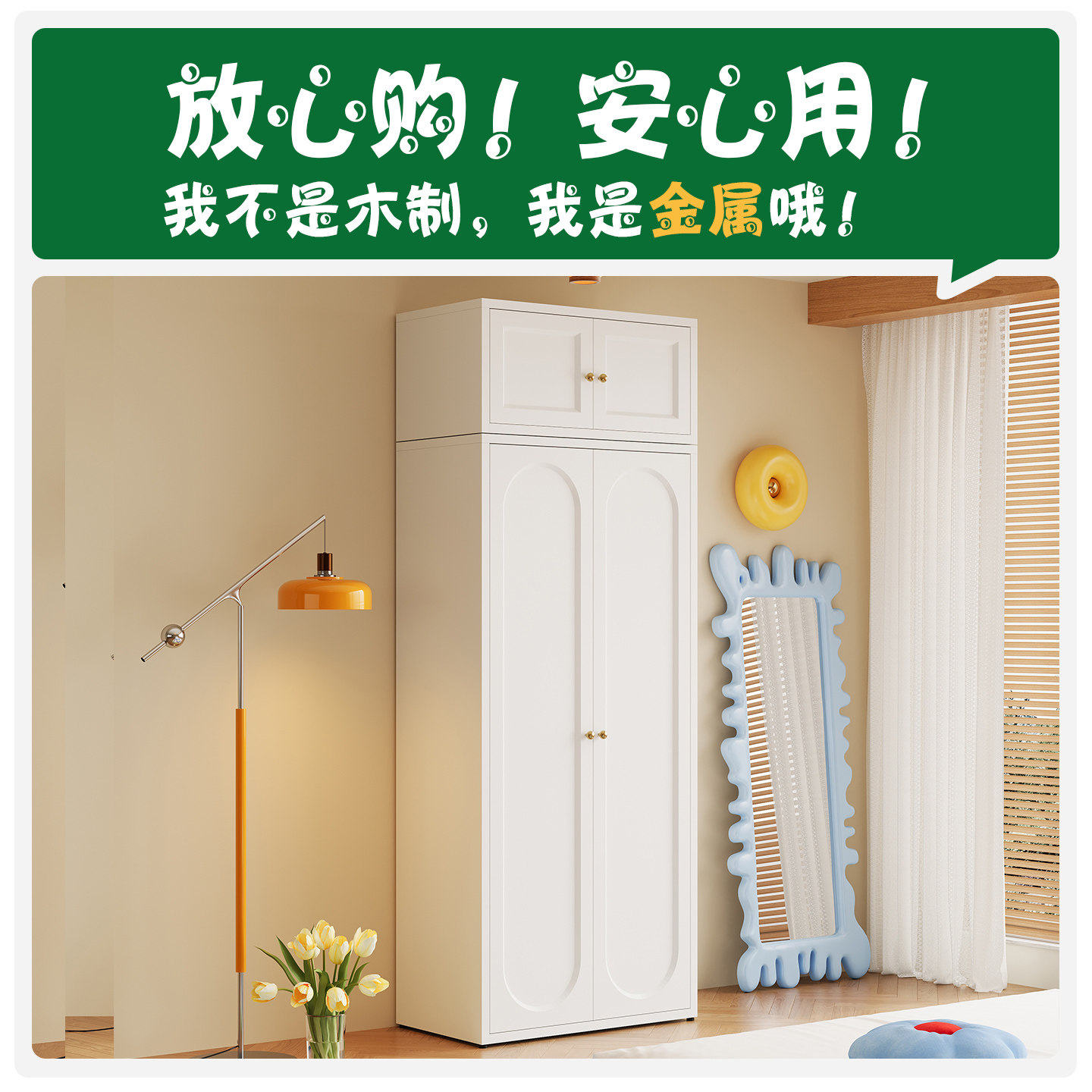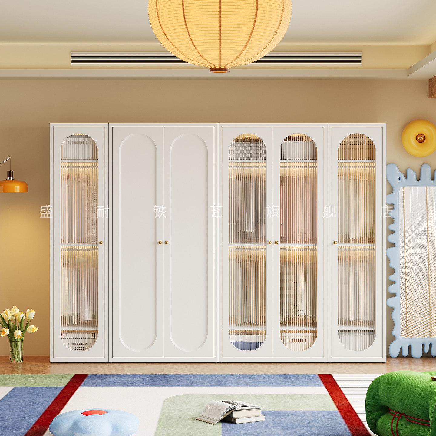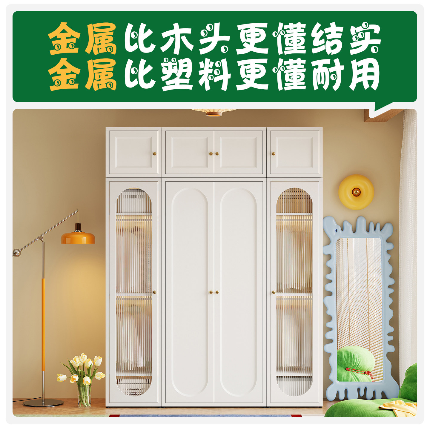 法式奶油风衣柜家用卧室轻奢无甲醛儿童铁皮衣橱组合玻璃门收纳柜