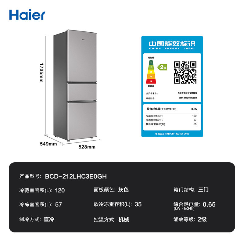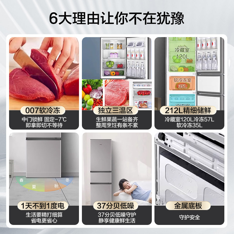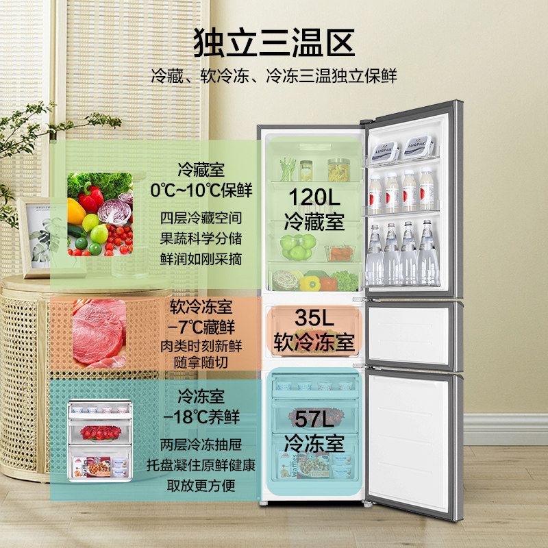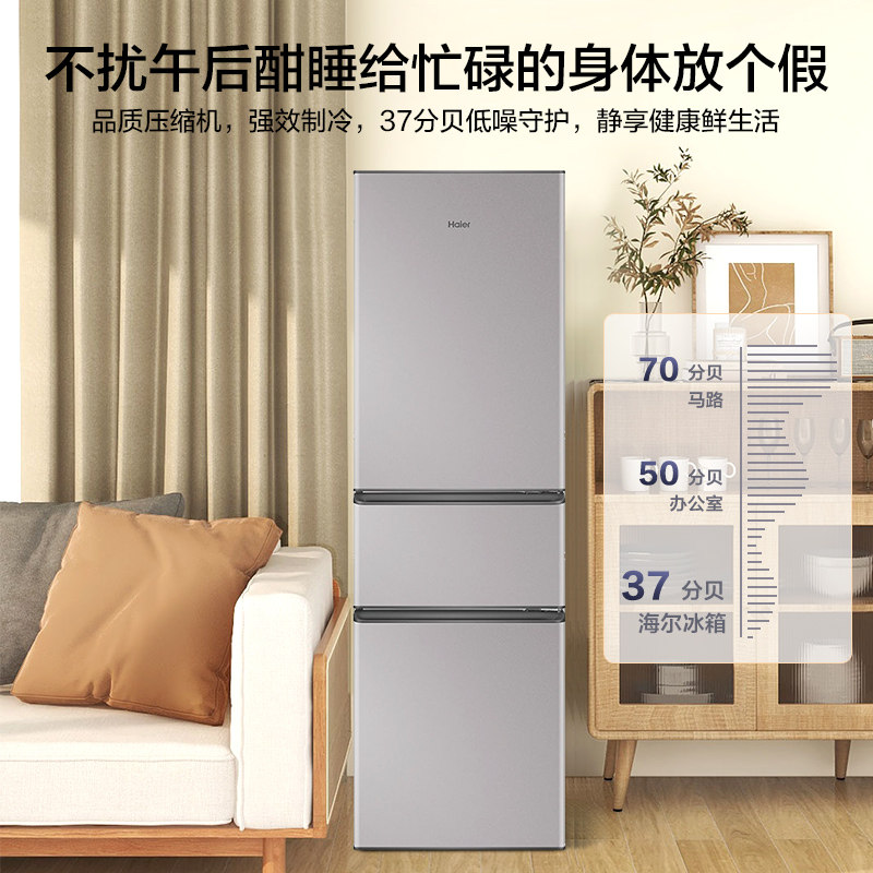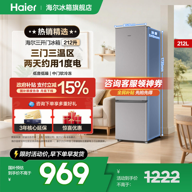 【国补告急】海尔冰箱212L三开门家用小型出租房宿舍节能官方正品