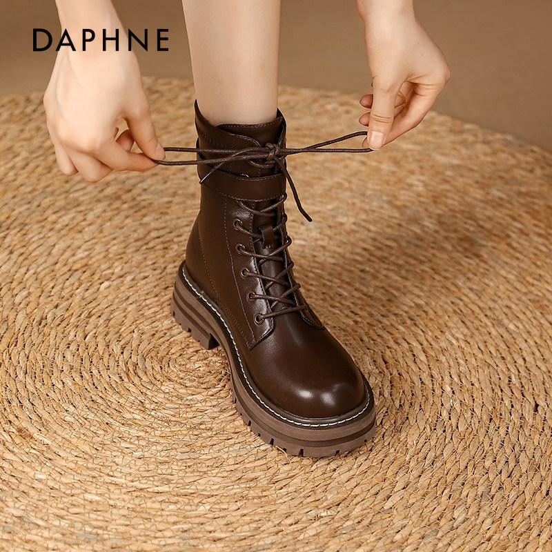 达芙妮马丁靴女2023爆款秋季英伦风系带棕色靴子女小个子厚底短靴