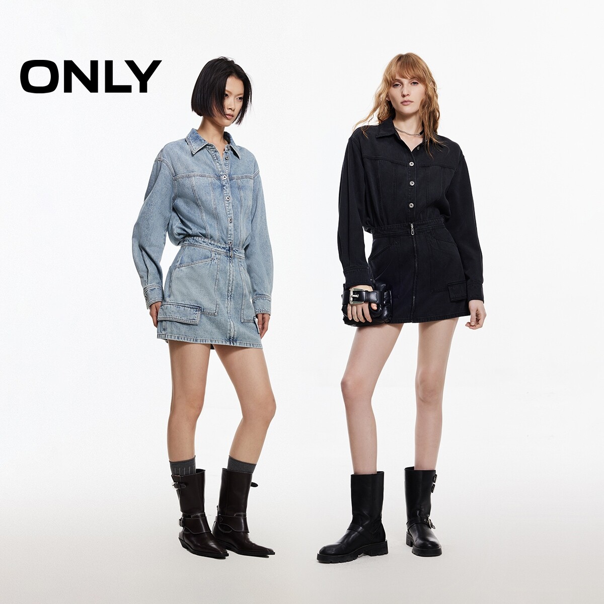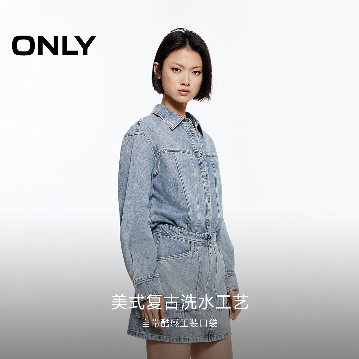 【ONLY奥莱】春季新款拼接时尚假两件酷感水洗牛仔裙短裙连衣裙女