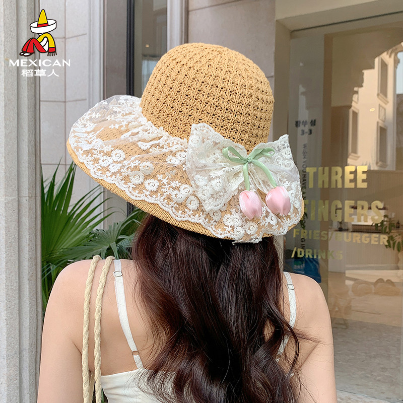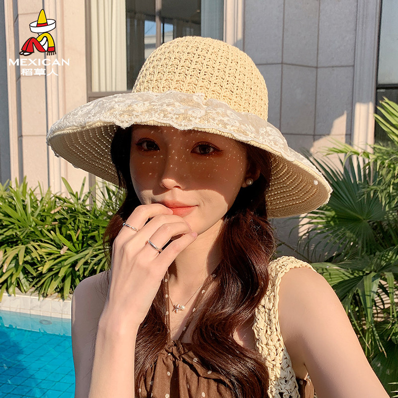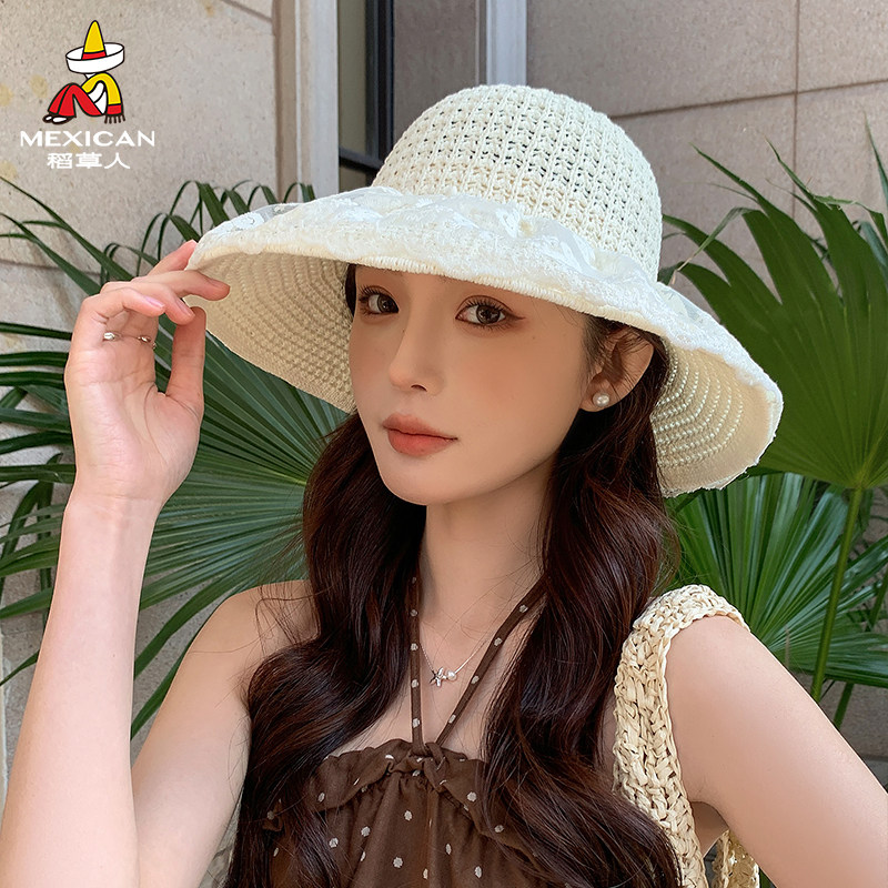 稻草人夏季女士宽檐草帽蕾丝渔夫帽防晒遮阳帽出游度假沙滩百搭