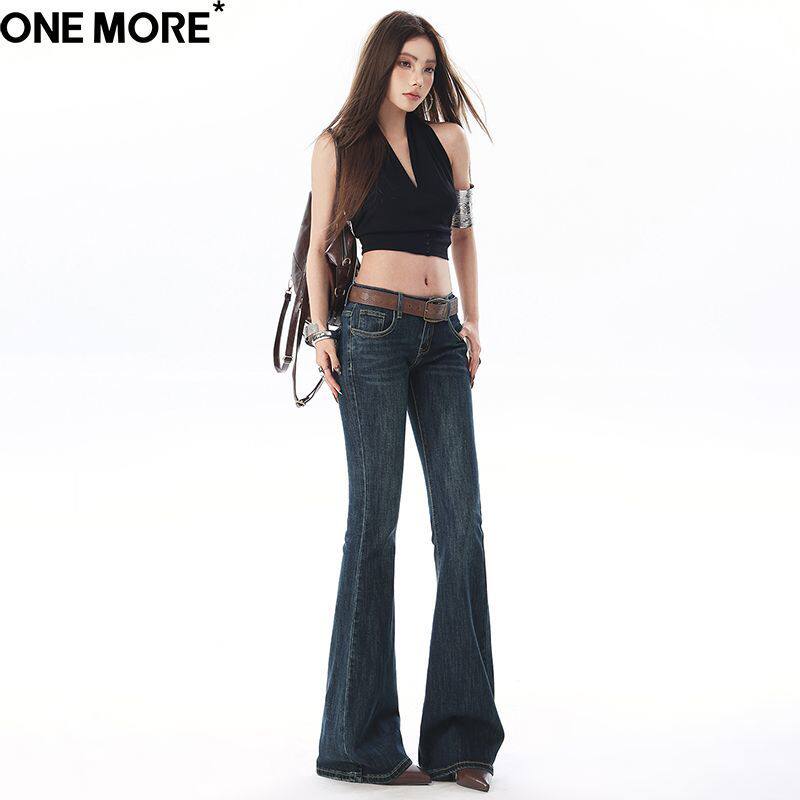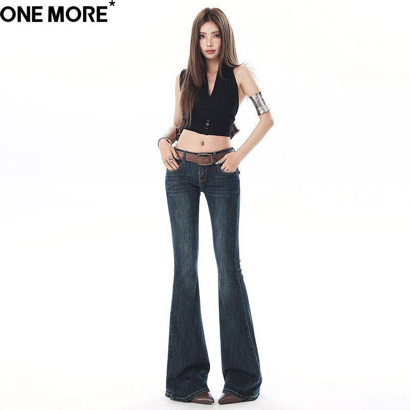 One More美式经典翻盖低腰微喇牛仔裤女2026春季弹力修身喇叭裤子