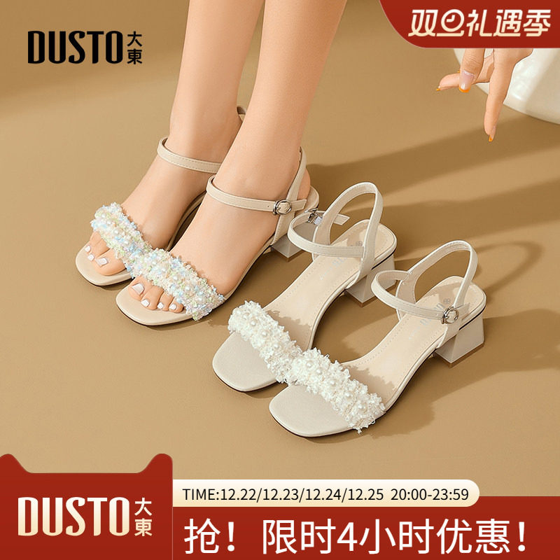 大东一字带凉鞋女鞋2025夏季新款优雅粗跟高跟一字扣珍珠X0019