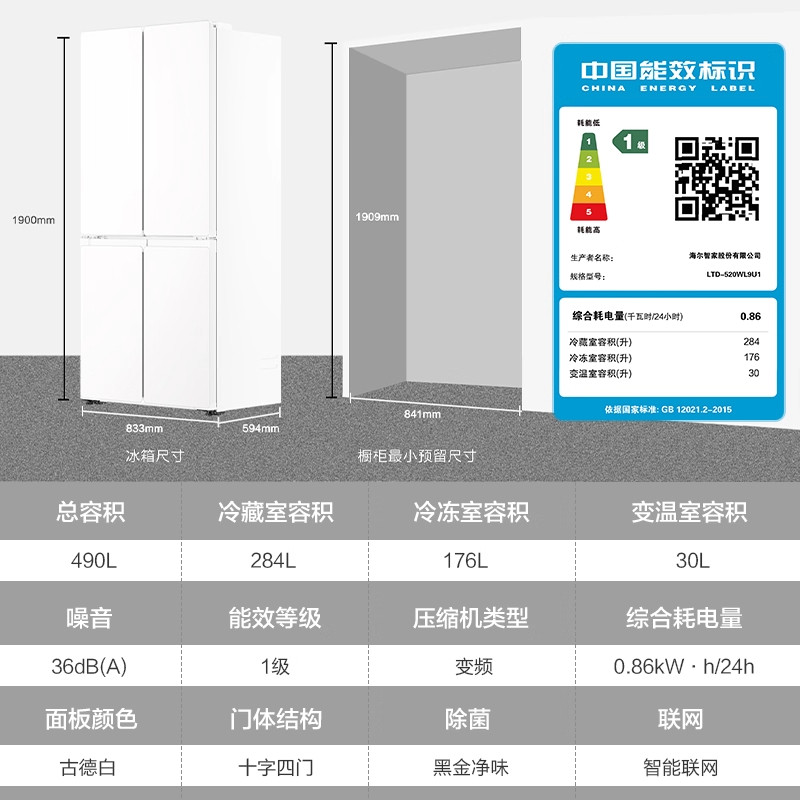 以旧换新补贴海尔539L十字双开四门一级能效无霜电冰箱家用大容量