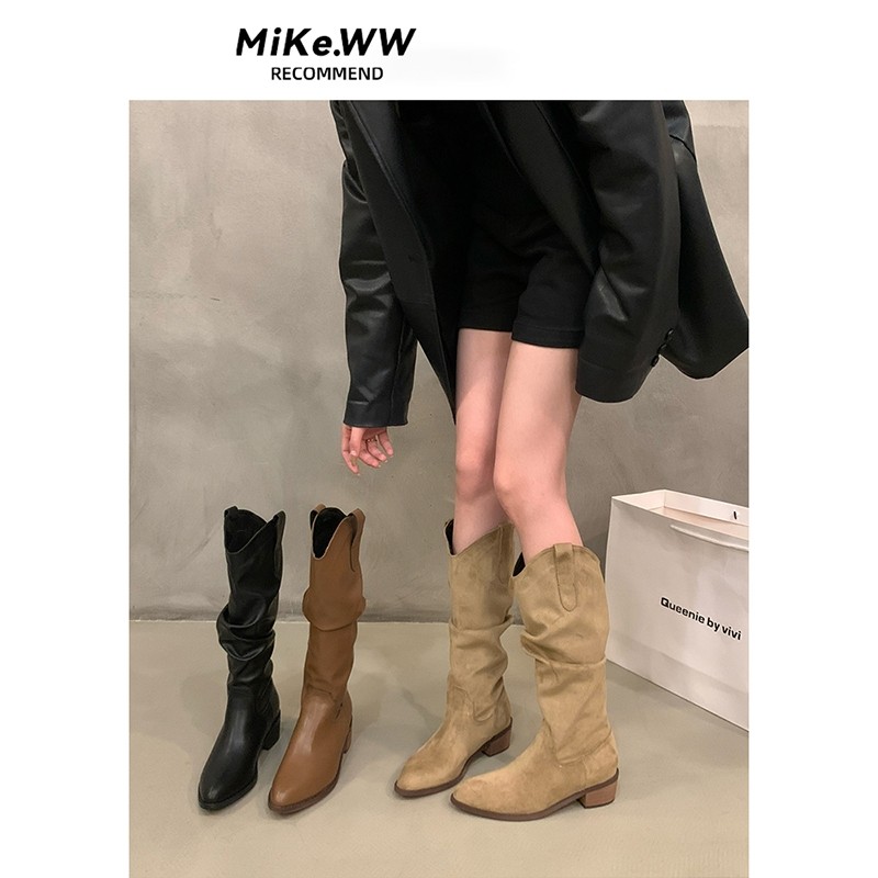 V口堆堆中筒长靴女鞋2025春秋冬季尖头西部牛仔长筒靴子绒面杏色