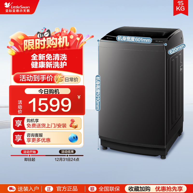 [纯净]小天鹅官方旗舰15KG全自动家用大容量波轮洗衣机TB15-1808T