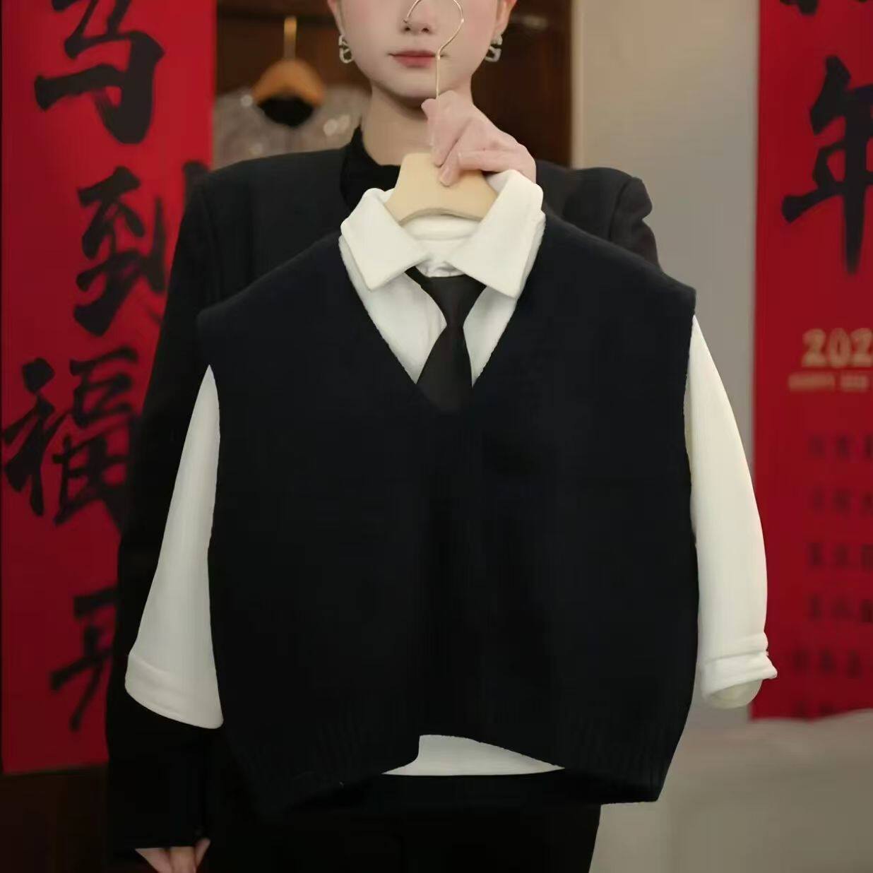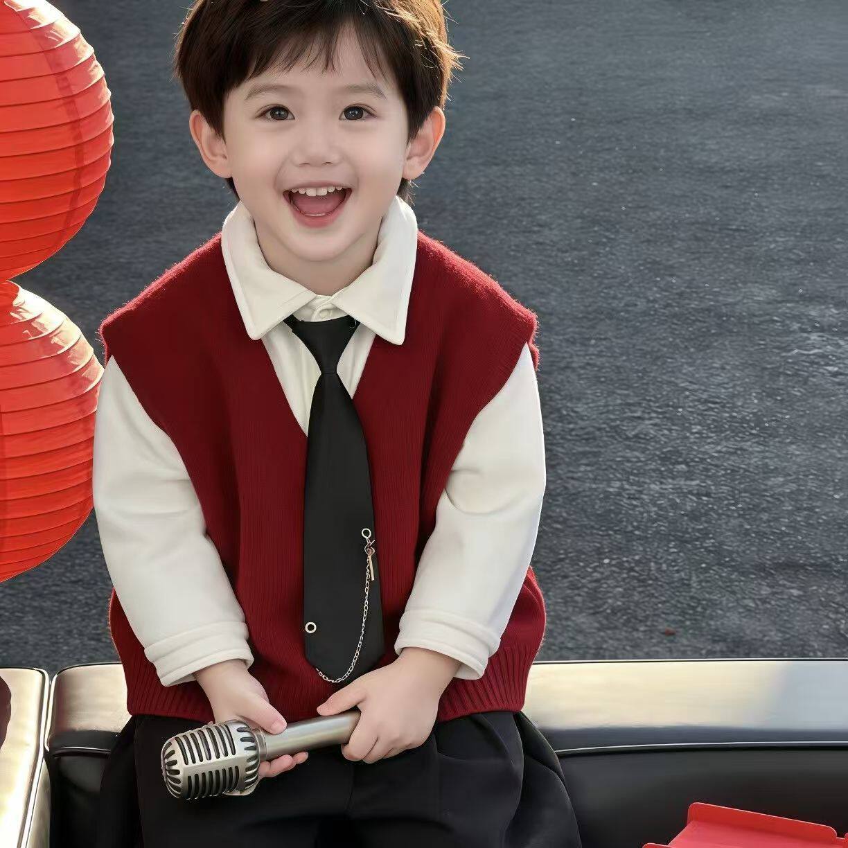 2026新款男童宝宝学院风红色针织马甲套装秋冬加绒衬衫两件套领带