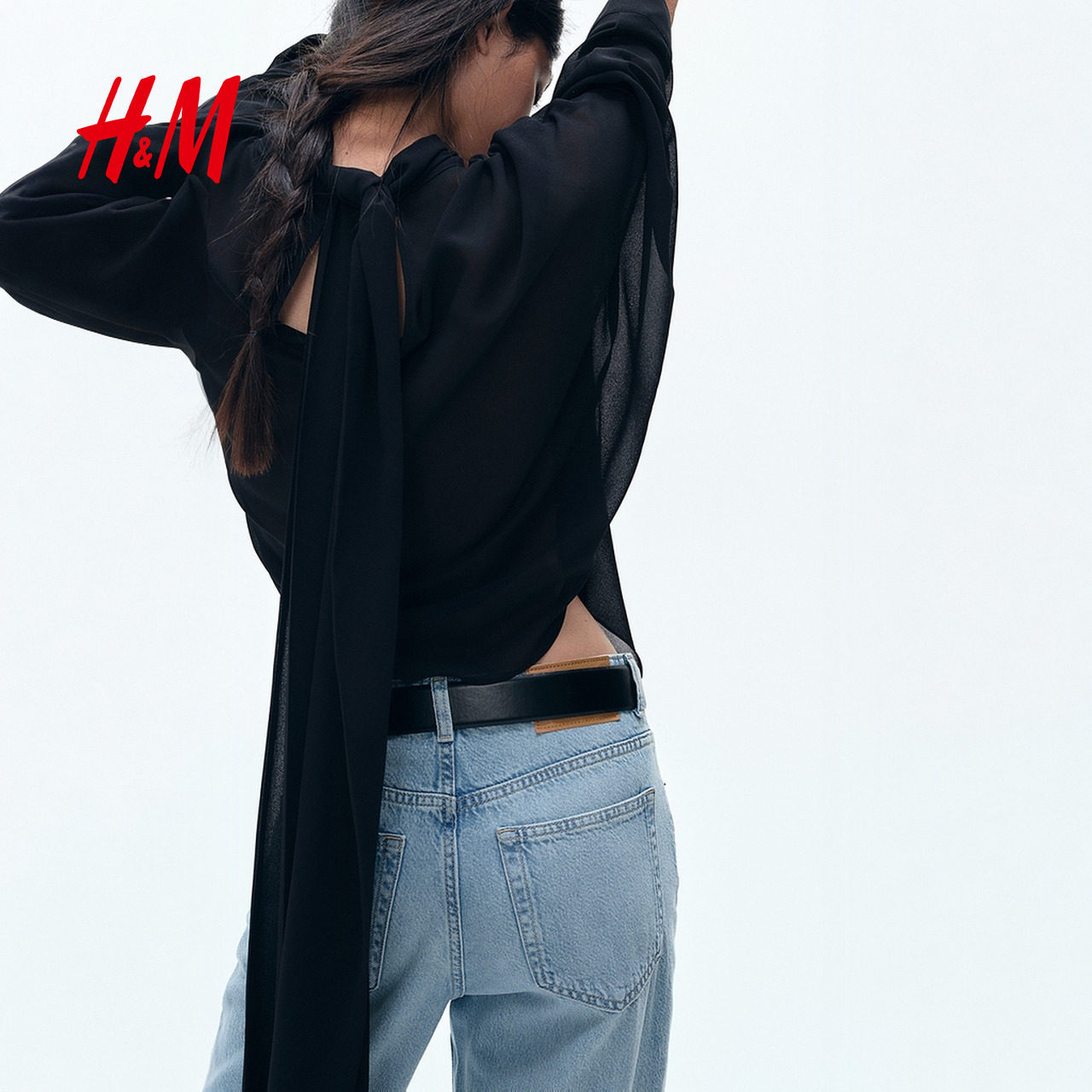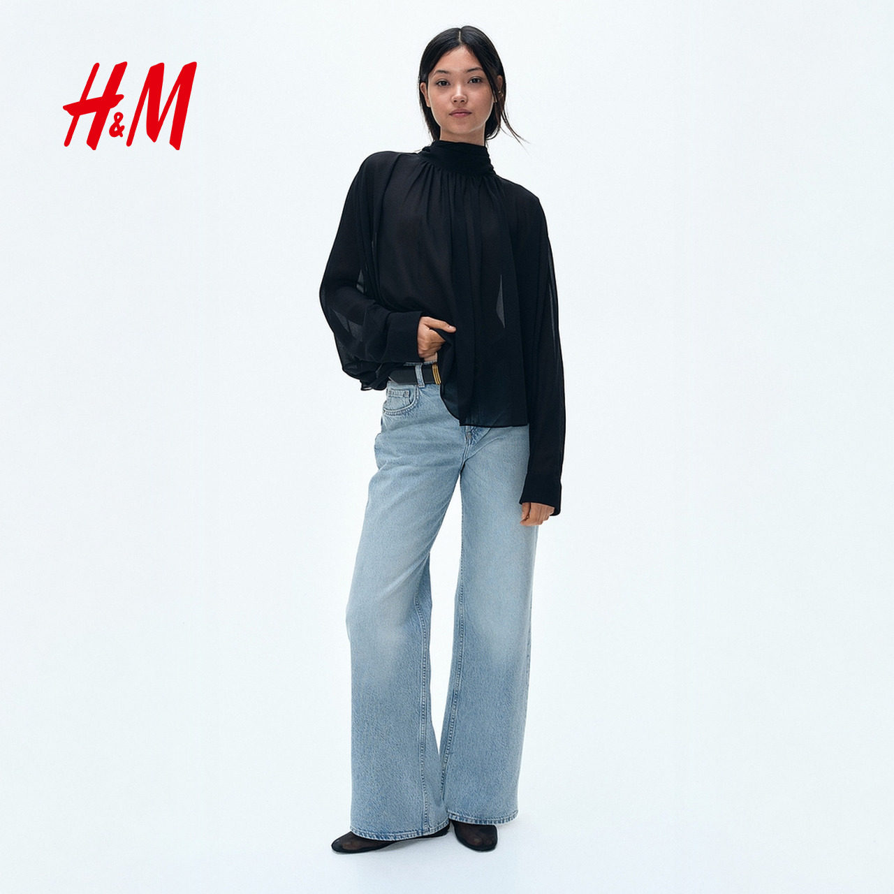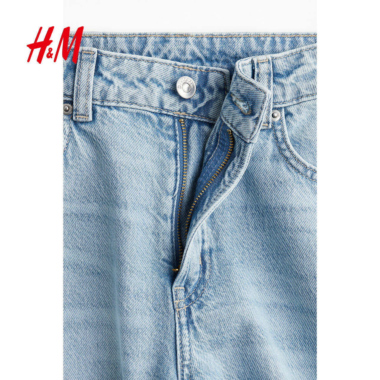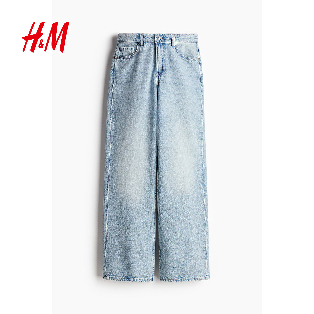 HM女装透气5袋式棉质直筒高腰阔腿牛仔裤休闲长裤0871889