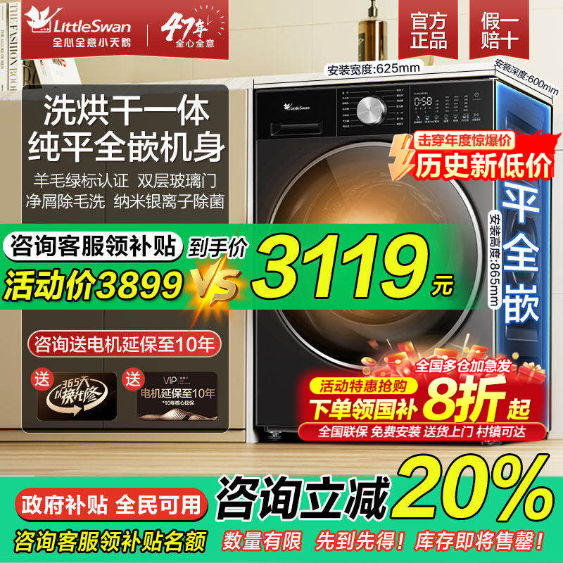 小天鹅水魔方滚筒洗衣机小乌梅超薄10公斤洗烘一体全自动家用3.0