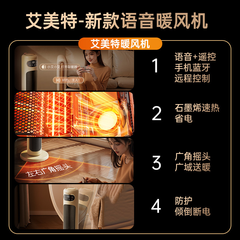 艾美特AI语音取暖器家用石墨烯暖风机电暖器智能遥控预约定时节能