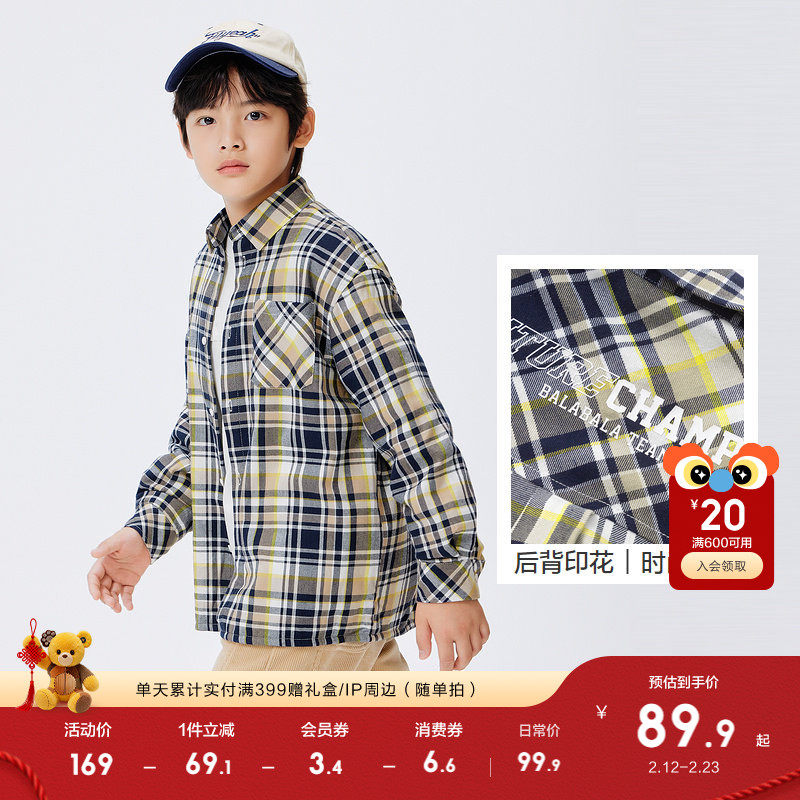巴拉巴拉童装男童衬衫儿童长袖加绒中格子衬衣上衣红色拜年服喜庆
