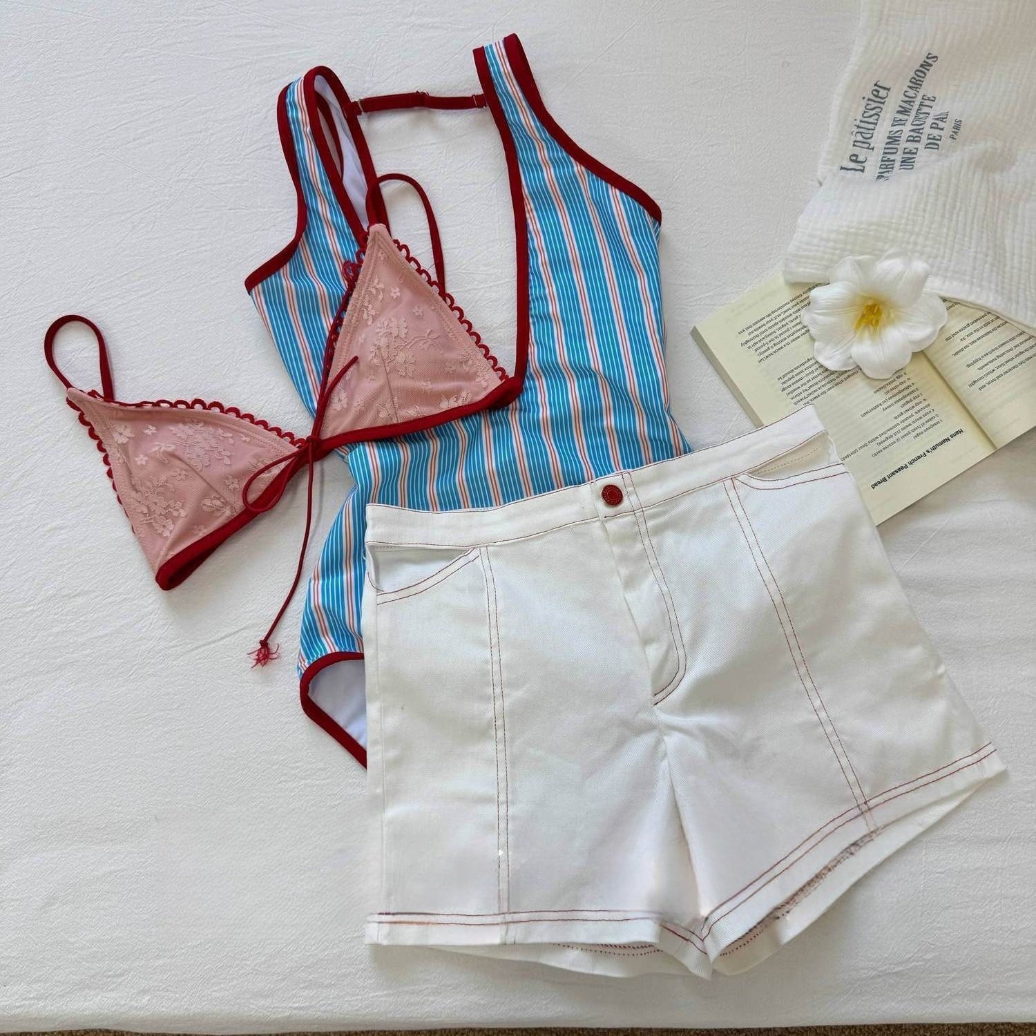 2025新款夏季泰国小众蝴蝶结条纹连体泳衣女高级感蓝色条纹比基尼