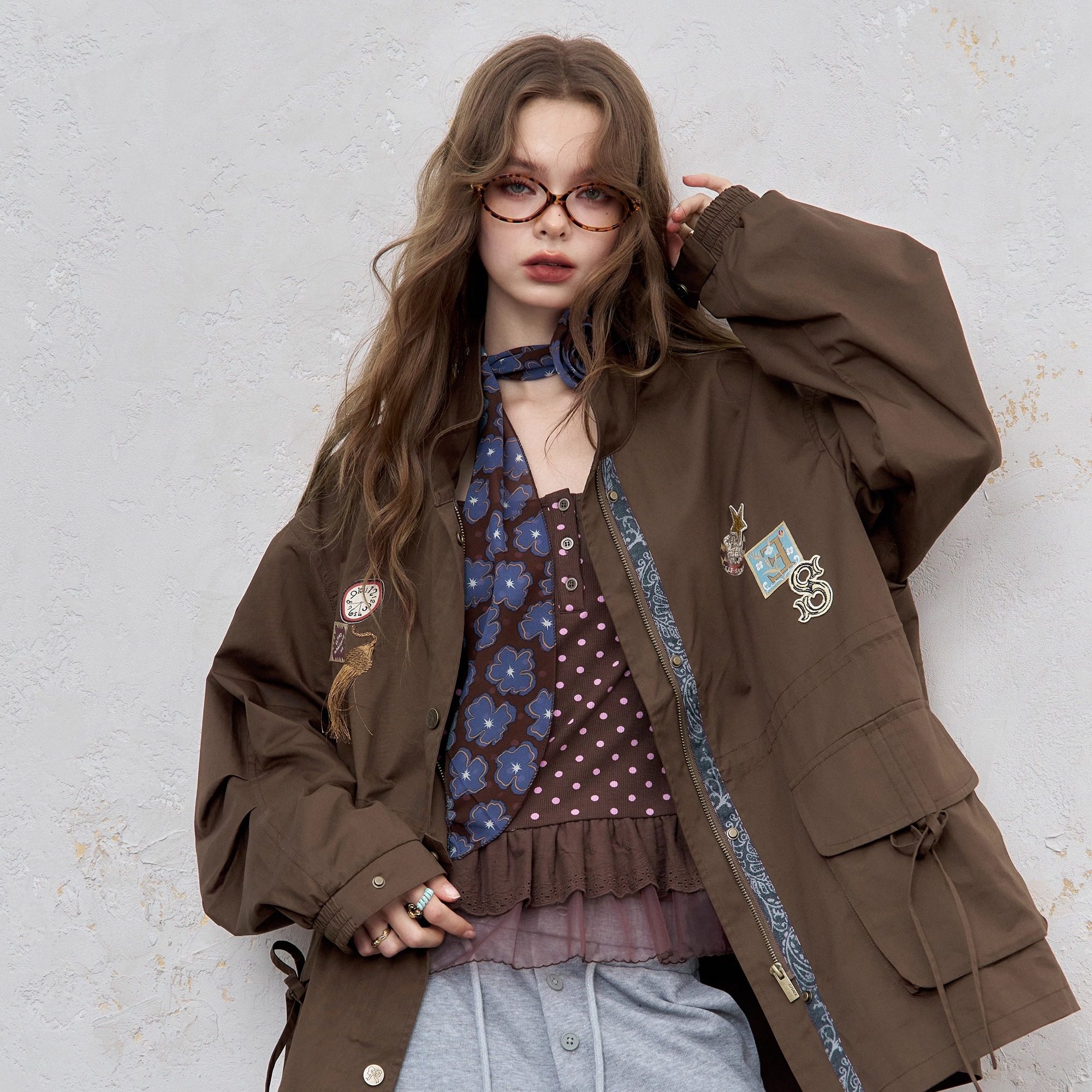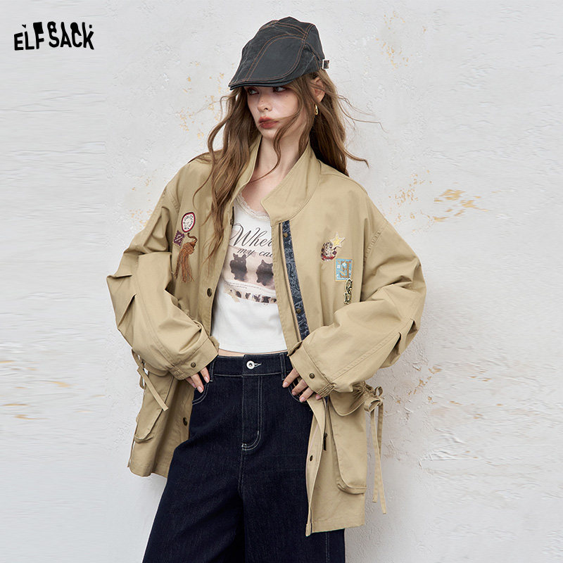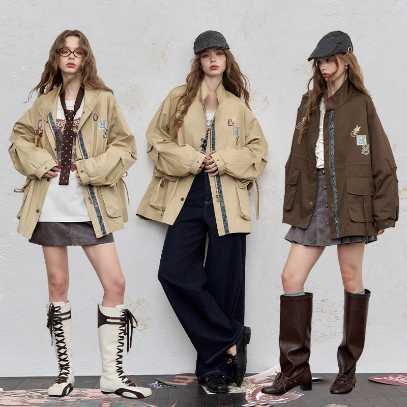 妖精的口袋原创刺绣宽松复古风衣女2025秋冬新款压褶显瘦工装外套