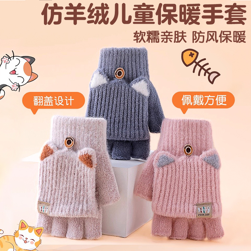 儿童手套男童冬季保暖小孩写字五指翻盖男孩小学生半指写作业大童