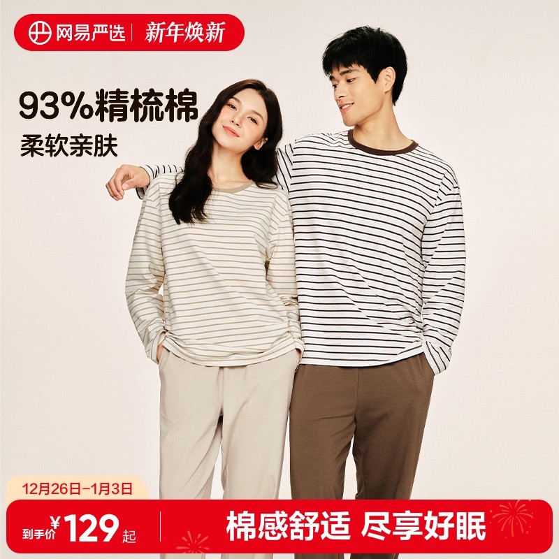 网易严选情侣睡衣男女式棉感条纹家居服2025秋新款抗静电防螨抑菌