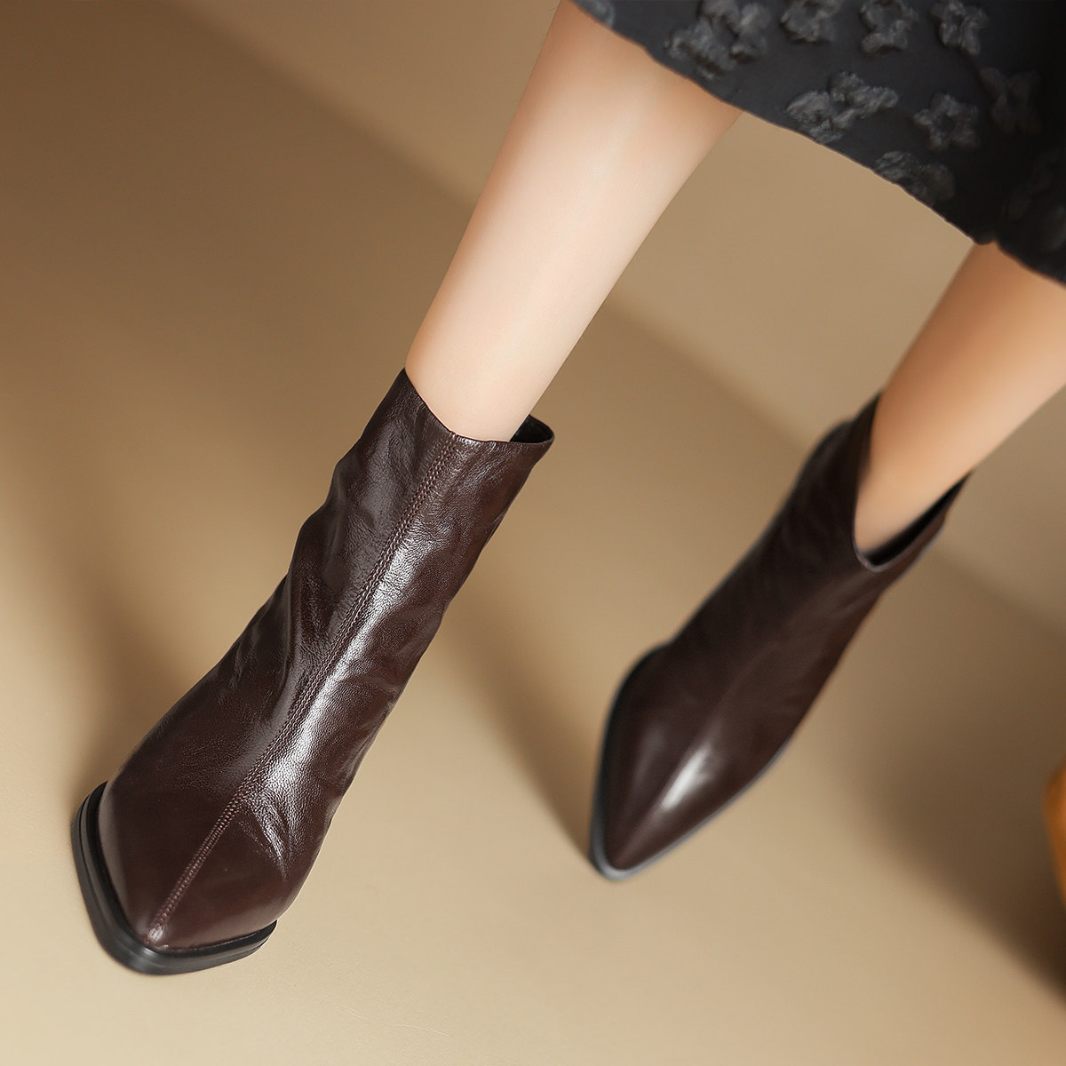 米霏!真皮~棕色方头瘦瘦靴女粗跟马丁靴切尔西高跟短靴大码女靴