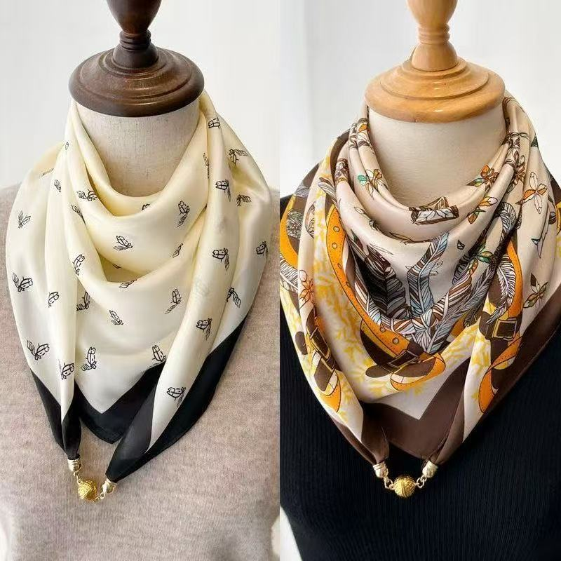 磁吸扣仿真丝方巾新款春秋冬三角围巾丝巾护颈时尚红围脖保暖丝滑