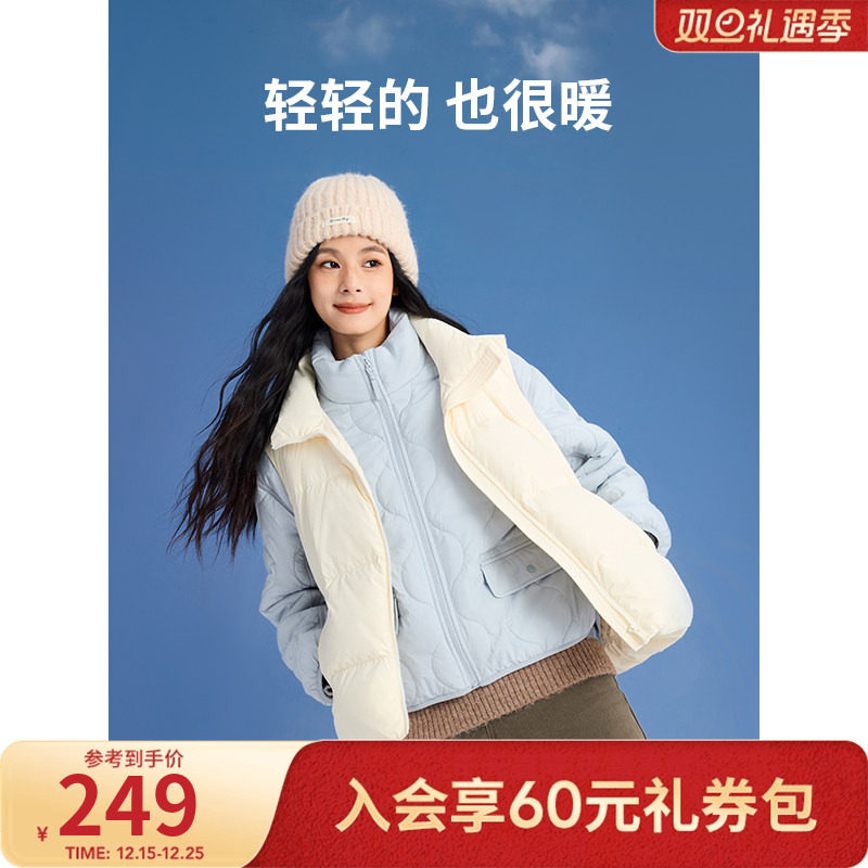 拉夏贝尔2025轻薄羽绒服女短款冬季韩版修身圆领无领内胆保暖外套