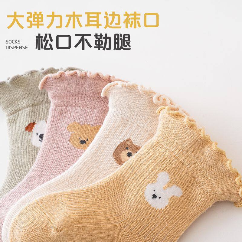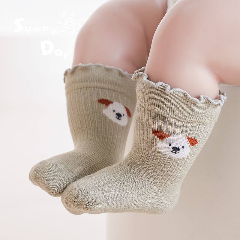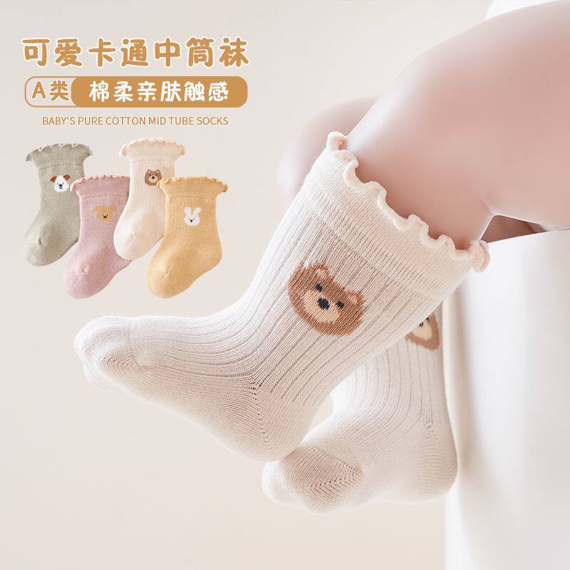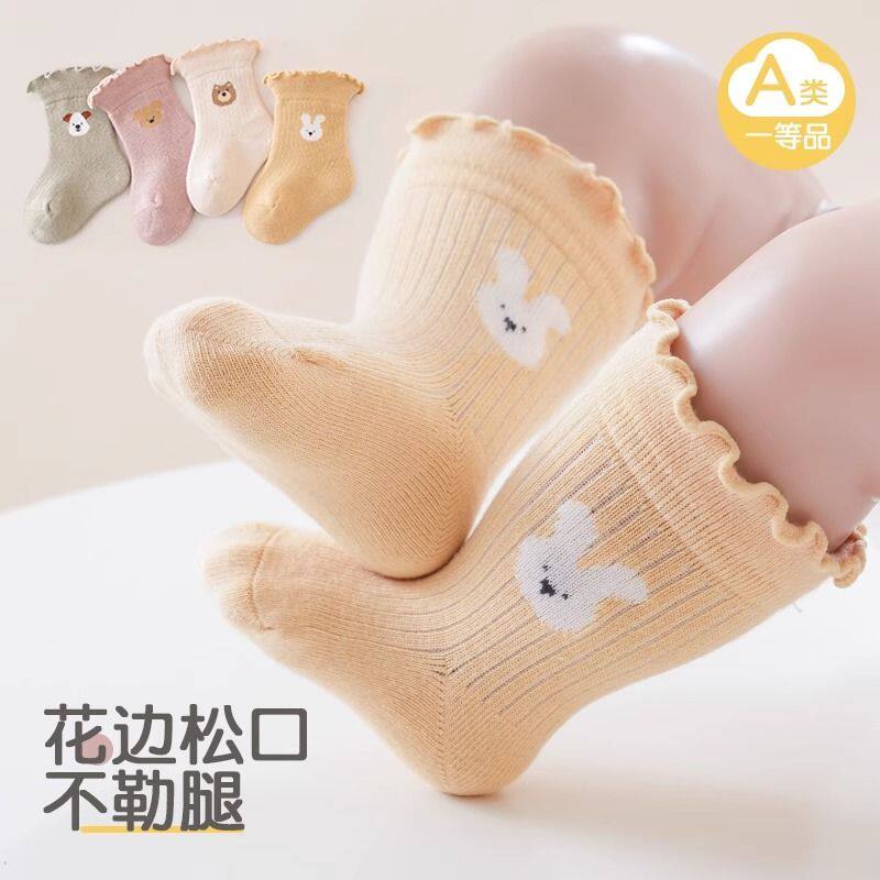 婴儿袜子春秋款女宝宝木耳边松口新生儿童绒棉不勒腿卡通中筒袜子