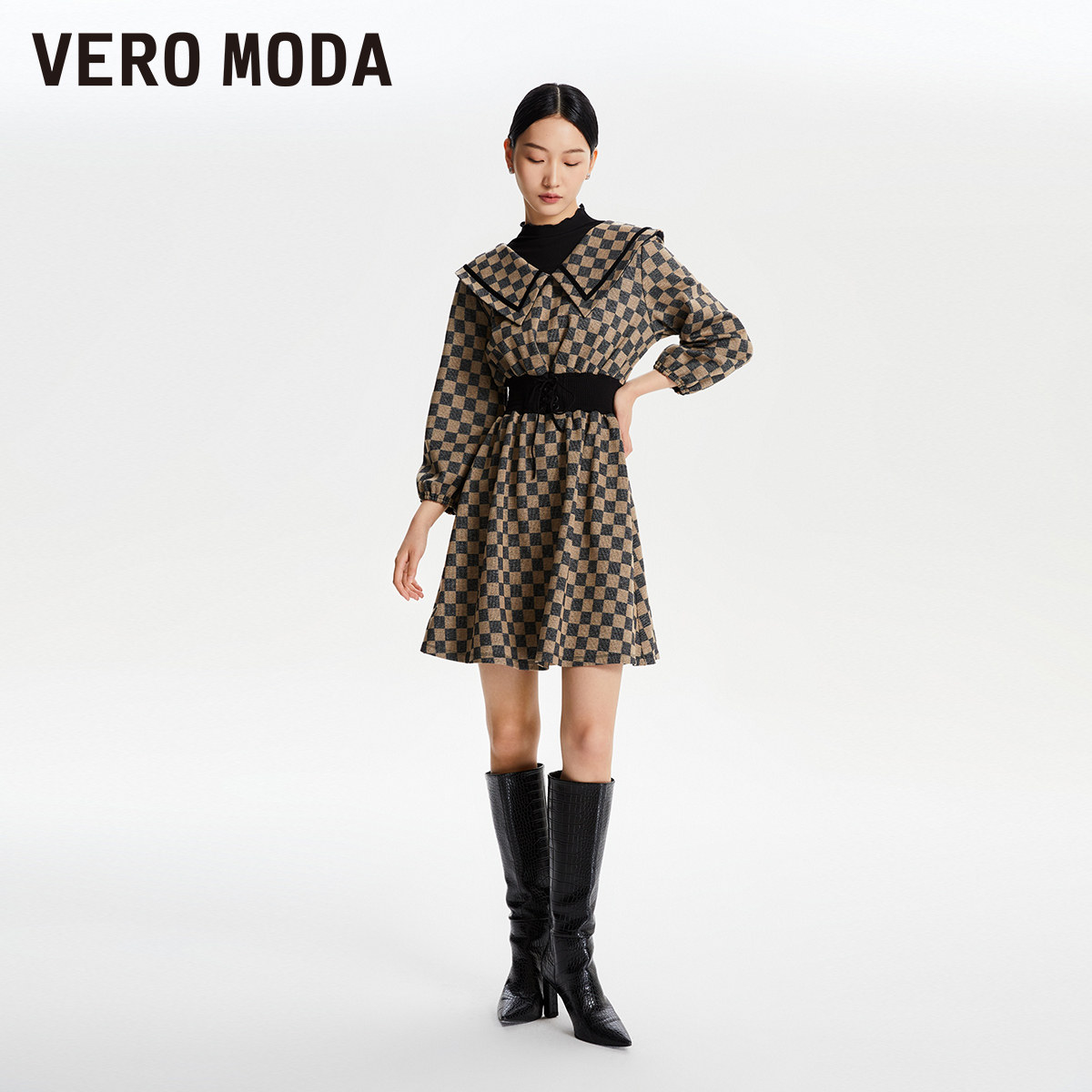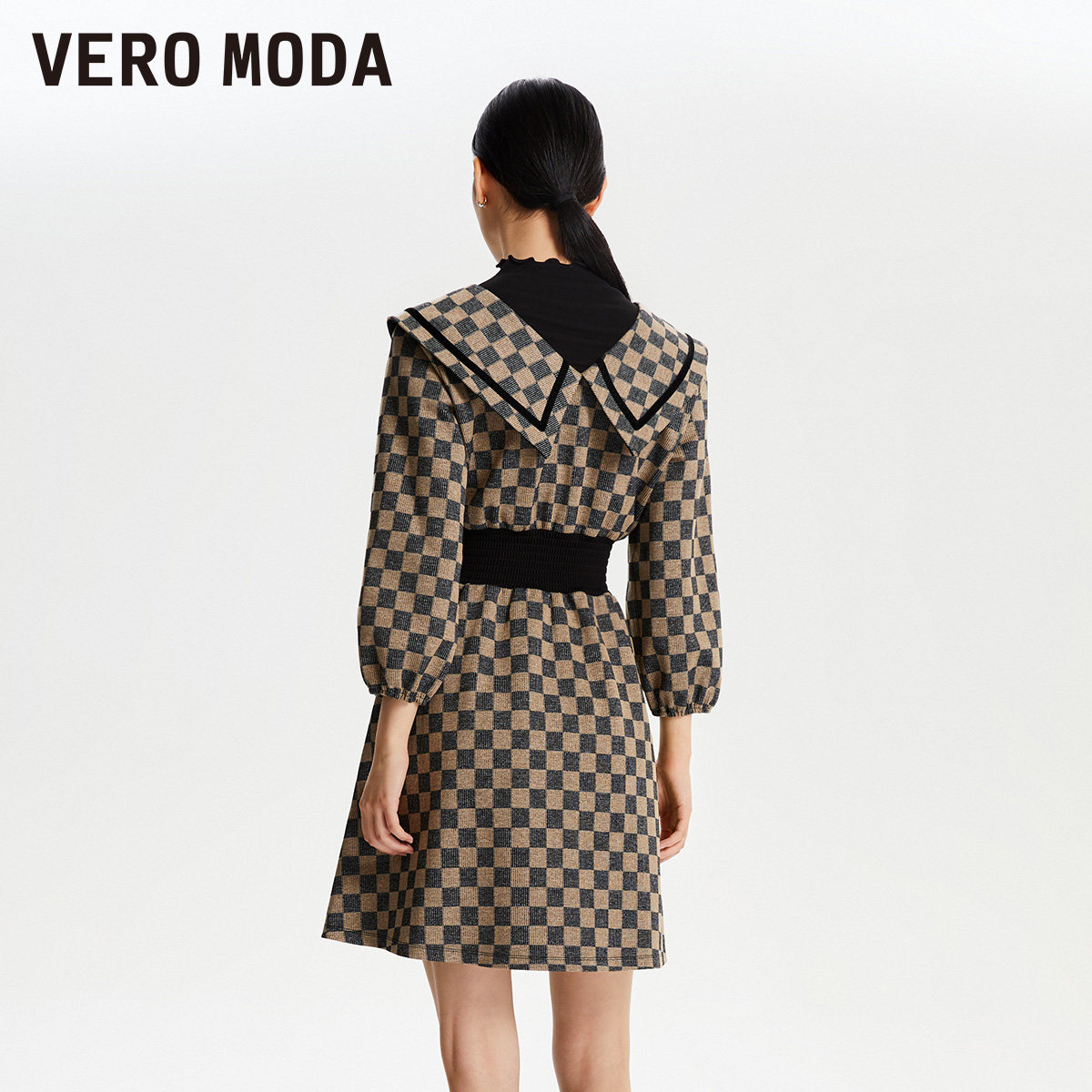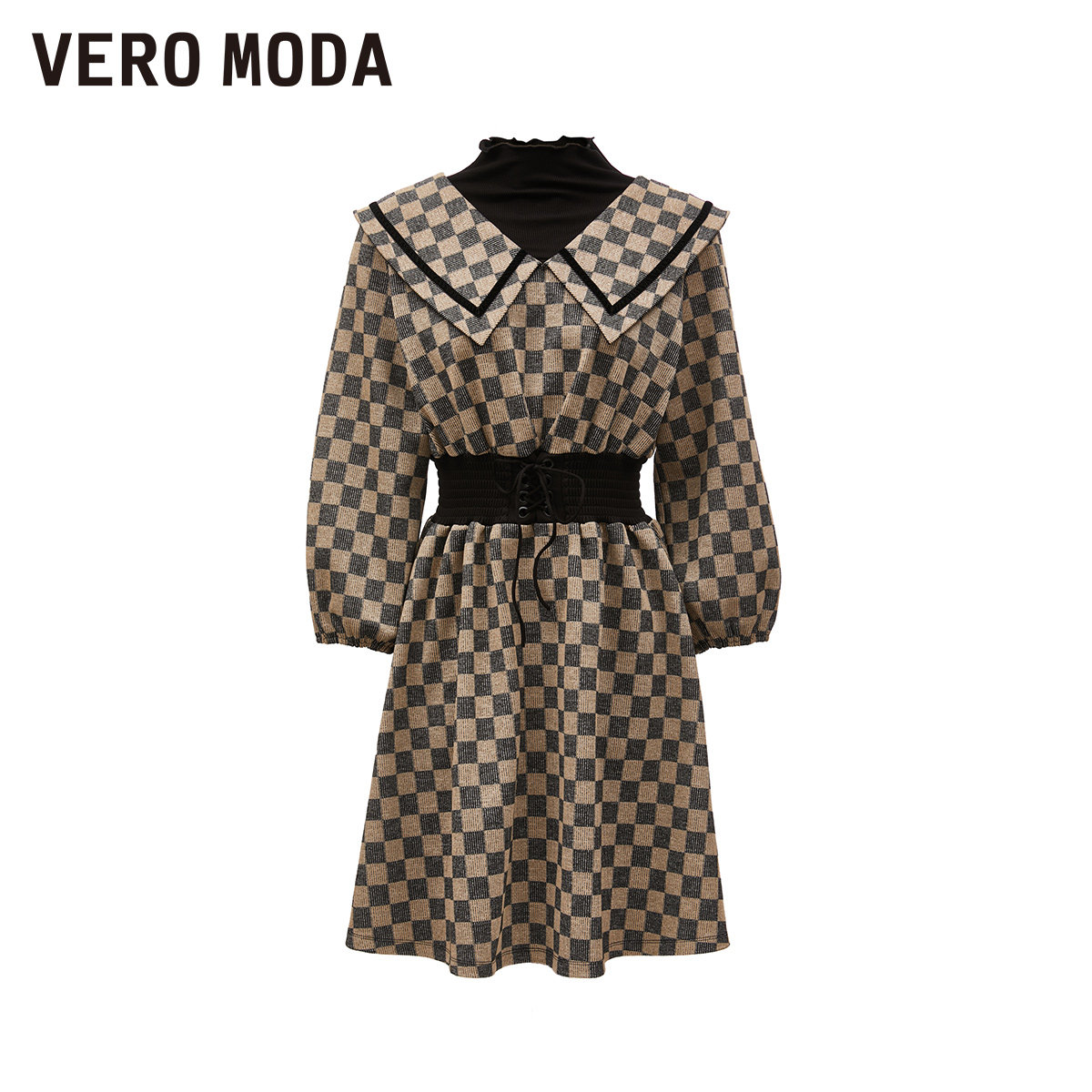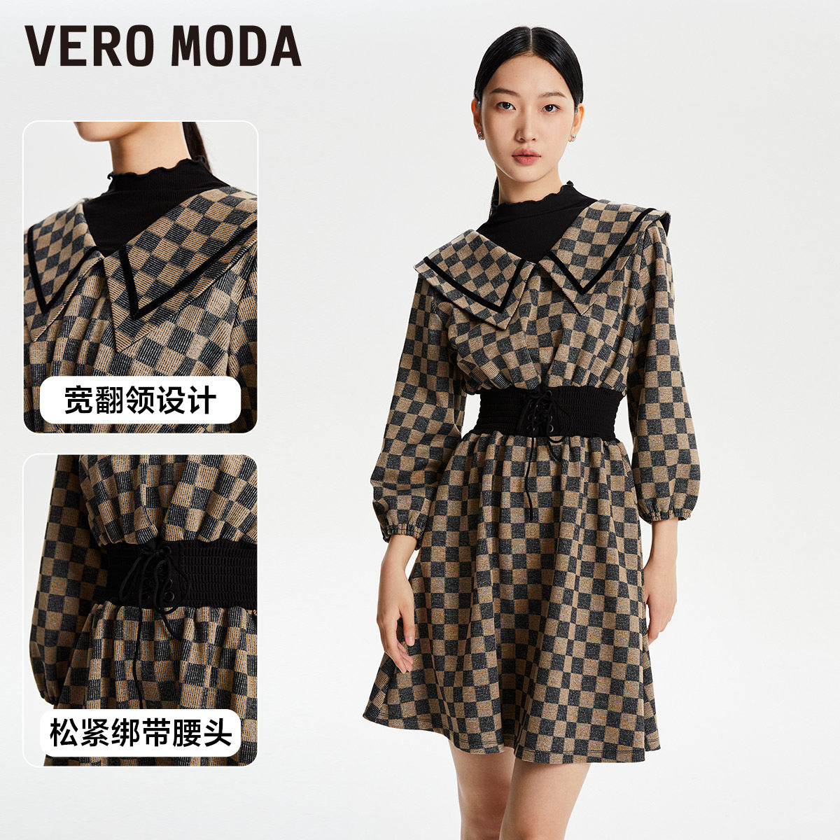Vero Moda奥莱连衣裙秋季新款收腰翻领格纹七分袖复古时髦流行