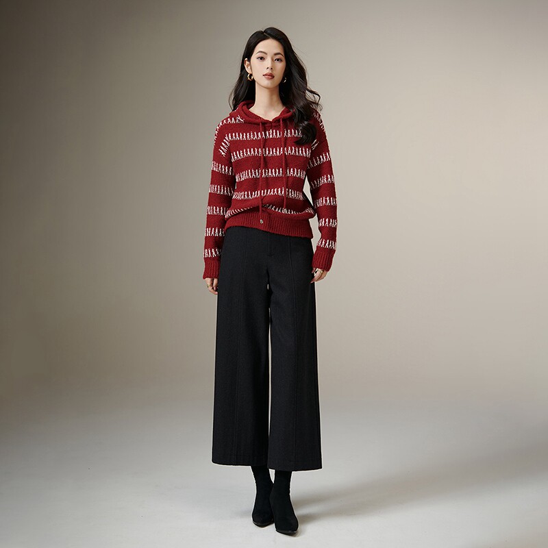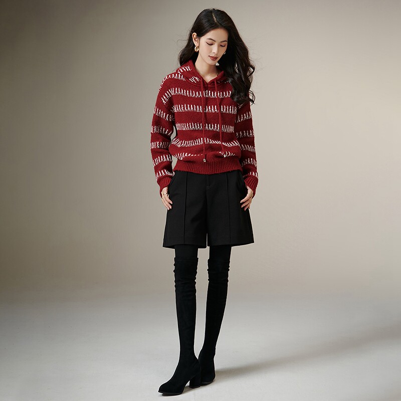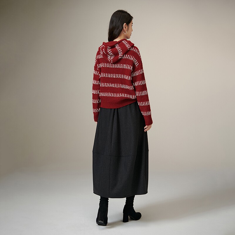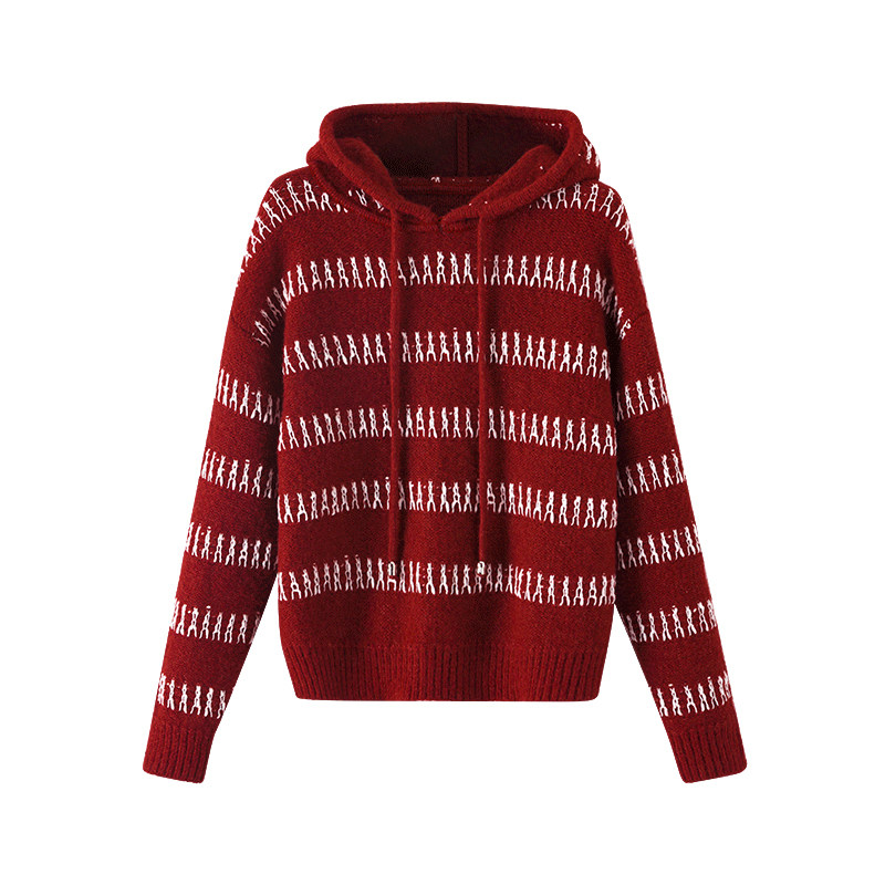 晚白【断码清仓】2025冬条纹红色新上衣连帽含绵大码厚针织衫女