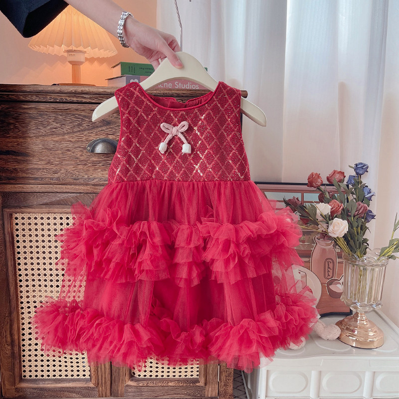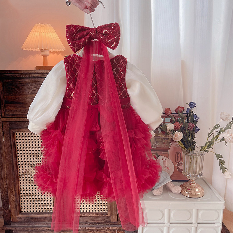 [抗菌远红外]女童连衣裙宝宝高领加绒蓬蓬网纱裙子儿童红色公主裙