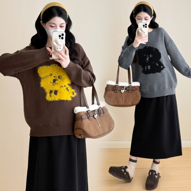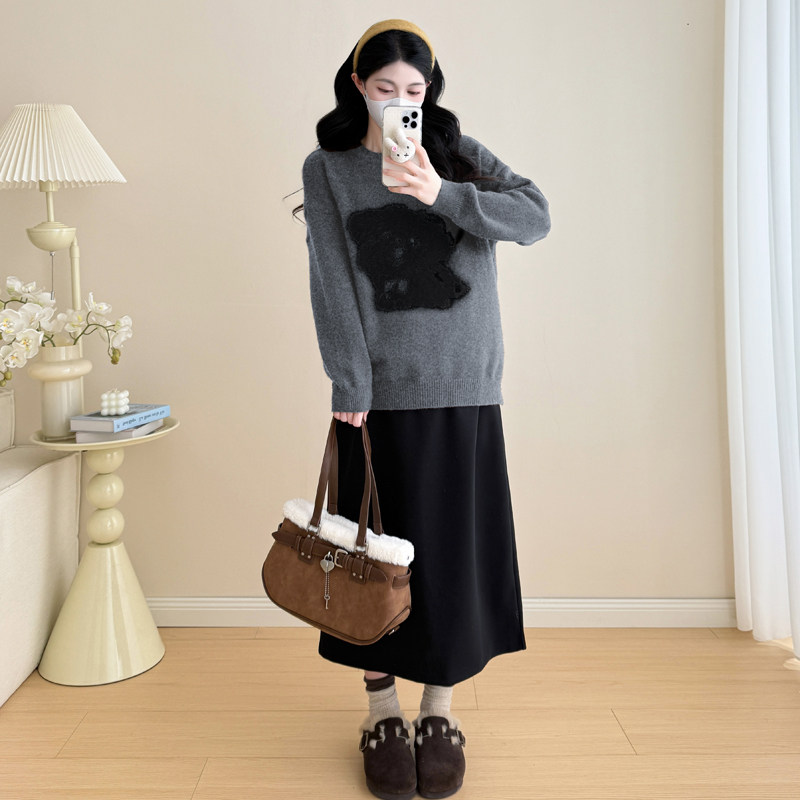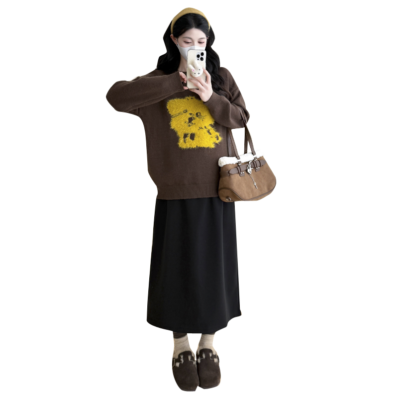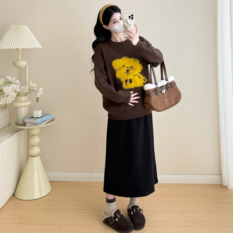婧麒孕妇装半身裙套装2025秋冬新款卡通小熊针织衫毛衣大码两件套