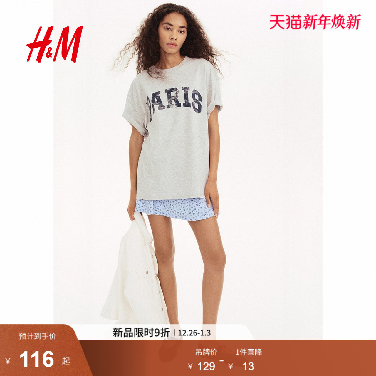HM女装T恤2025冬季新款印花圆领美式宽松棉质落肩短袖上衣1296379