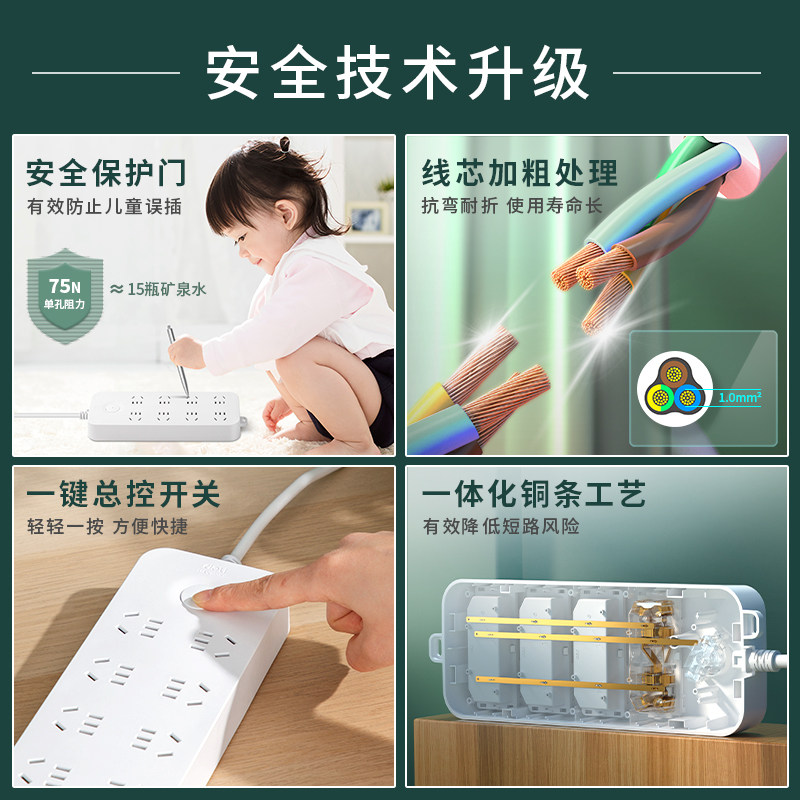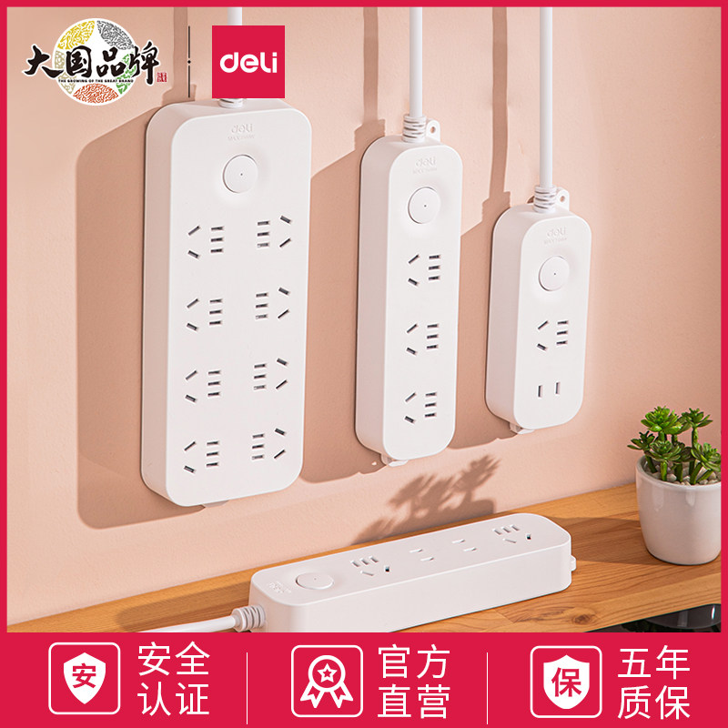 得力拖线板新国标3C认证拖线板插座1.8 3米 5米多功能插排4孔6孔8孔排插接线板家用儿童安全保护门多孔延长