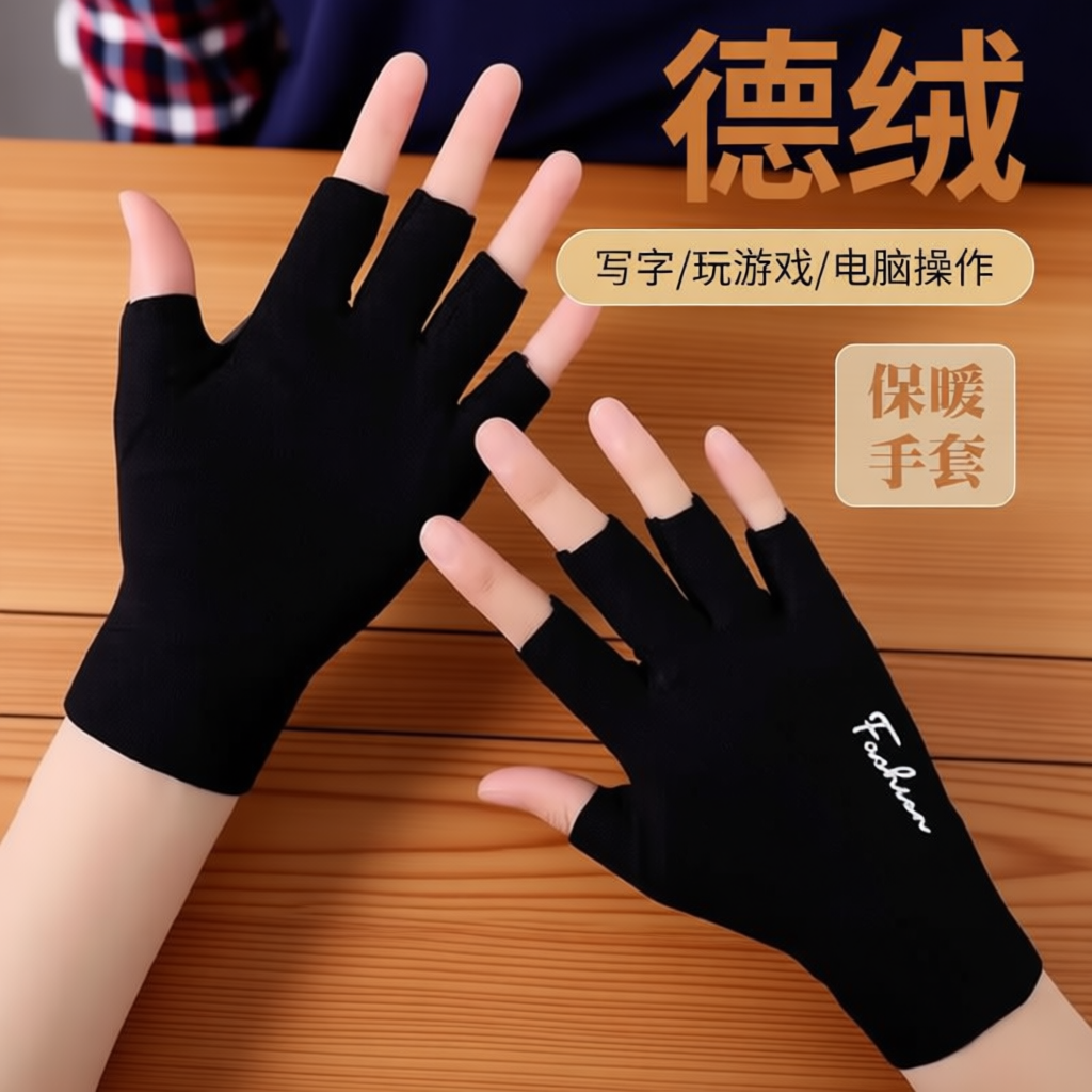 半指手套女冬季绒情侣薄款半截学生写字加绒保暖发热骑车德绒办公