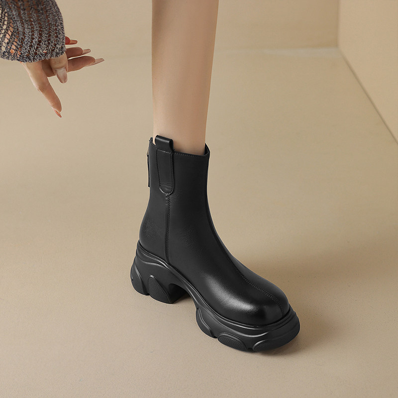 阿么手工女鞋时尚粗跟厚底短靴保暖圆头法式真皮鞋2025冬季新款