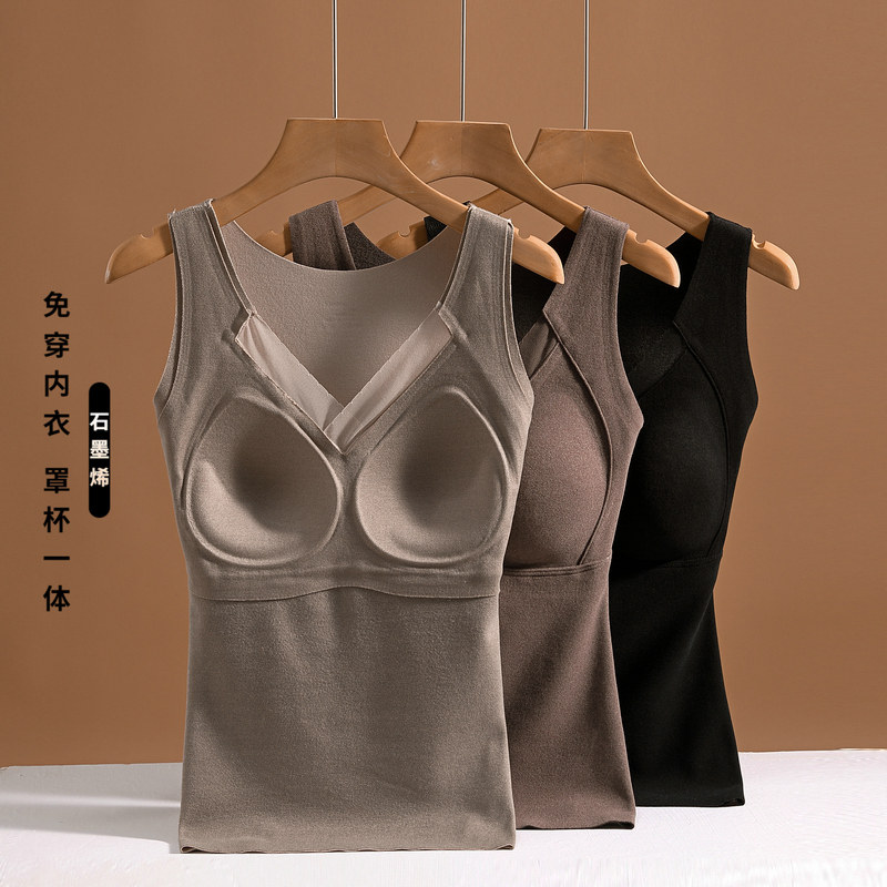 石墨烯保暖背心女秋冬加绒加厚发热德绒带胸垫一体固定杯贴身内衣