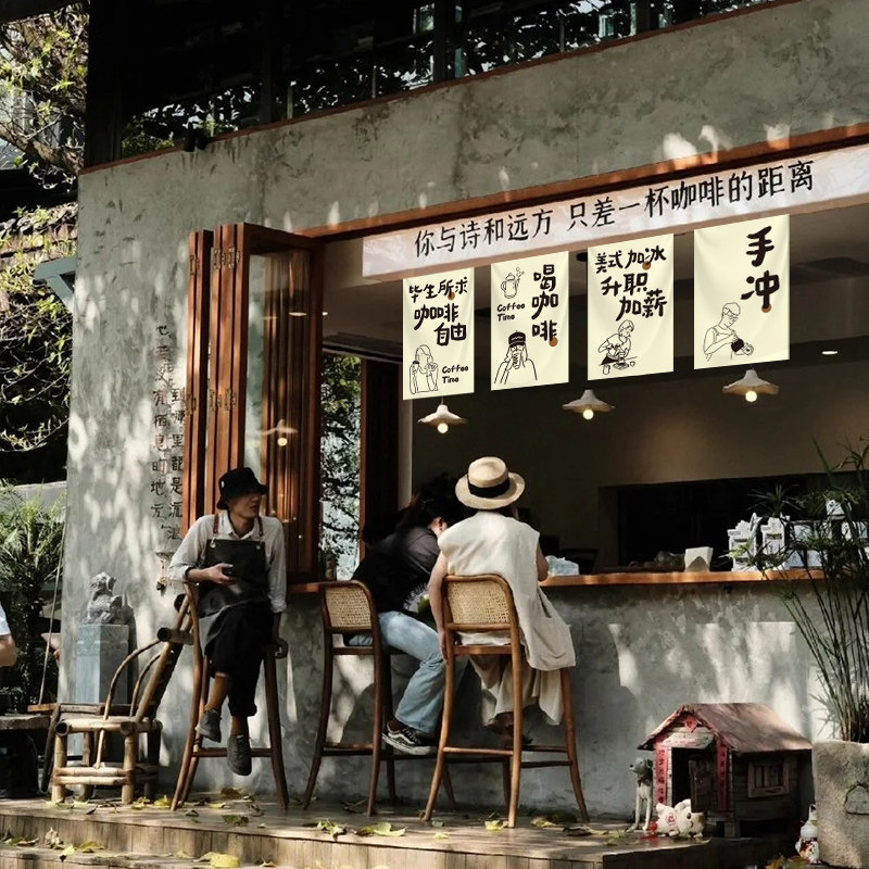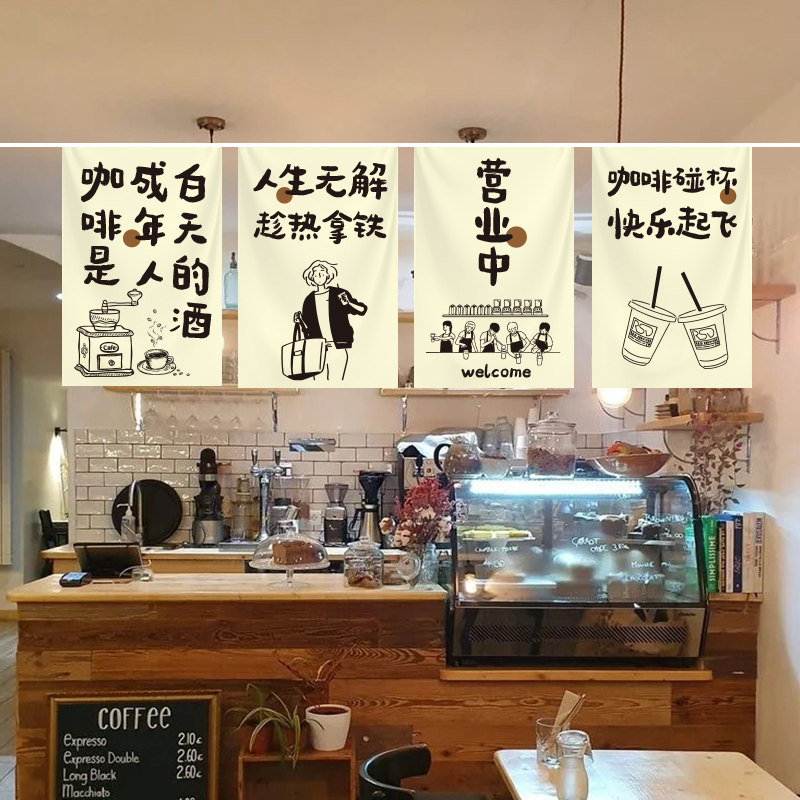 咖啡店门头装饰横帘墙面挂布市集奶茶串旗甜品美食餐饮挂旗摆摊招牌吊旗广告布旗帜定制露营氛围感布置背景布