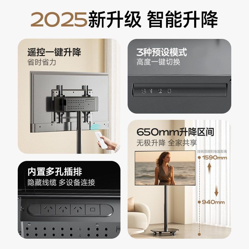 智能电动电视机移动支架遥控升降落地式带轮推车65/75寸通用挂架
